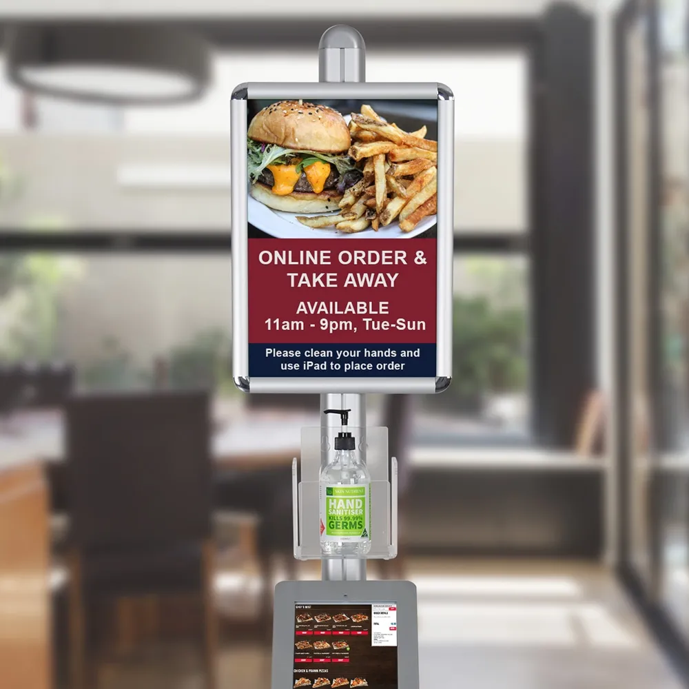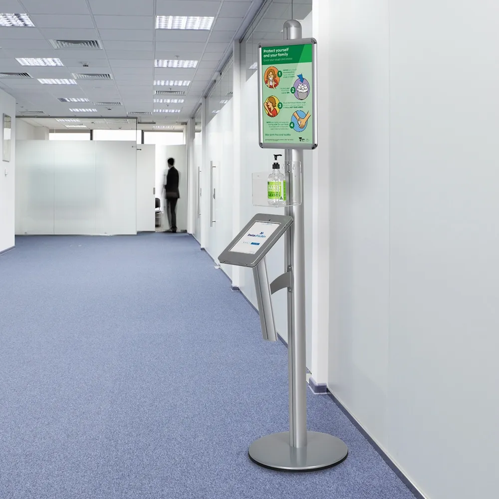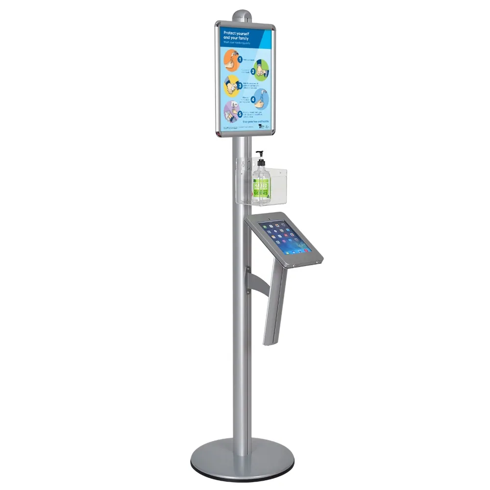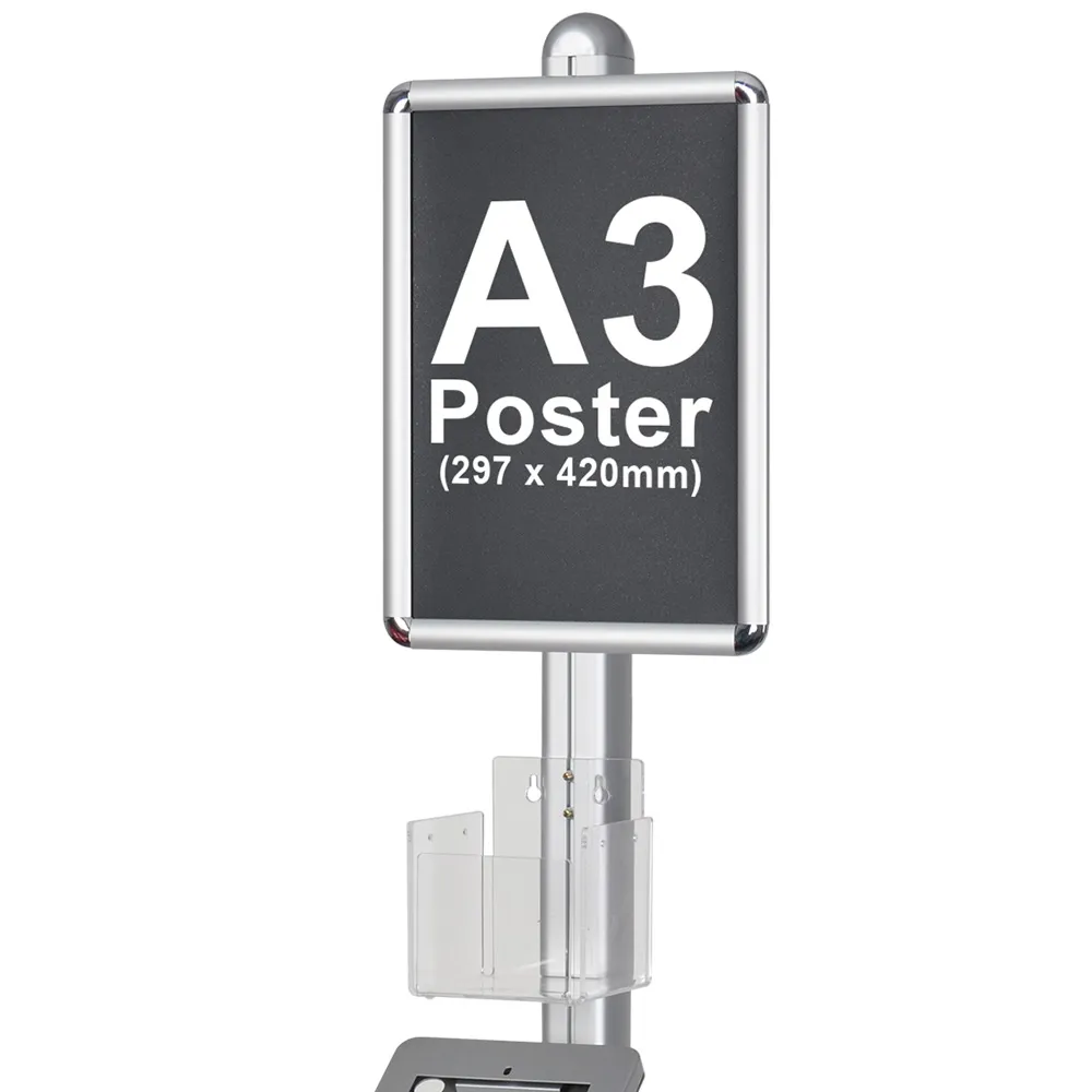 This standalone iPad kiosk, one of many business support essentials now on offer, includes an acrylic holder designed to display anti-bacterial wipes or hand sanitiser formula to allows users to free their hands of germs to help prevent the spread of diseases such as coronavirus. Made from 5mm thick clear perspex, this holder is height adjustable to easily be placed above the iPad for user convenience. A poster snap frame is also included that is designed to display A3 (420 x 297mm) standard sized posters in portrait format. No tools are needed for quick change-outs, with a protective lens provided to help prevent grime getting on poster.