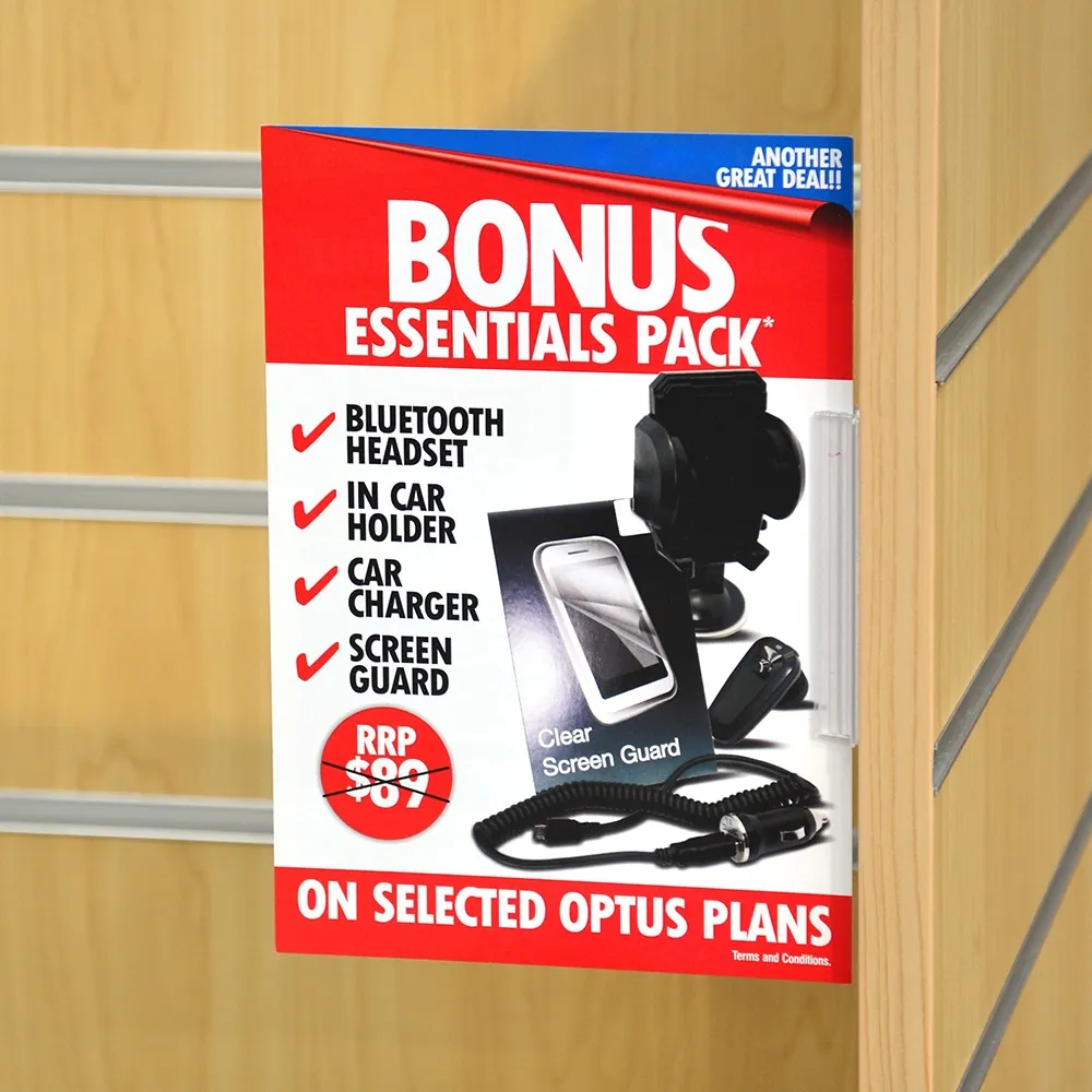 The sign clip is designed to hold signs in retail stores that show pricing information, advertisements, and help customers identify different product lines. The POS signage display use an adhesive backing that can attach to nearly any surface, able to be attached to most surfaces without issue. The versatile display can be attached to shelves, walls, and even ceilings to mount your signage exactly where it is needed most.