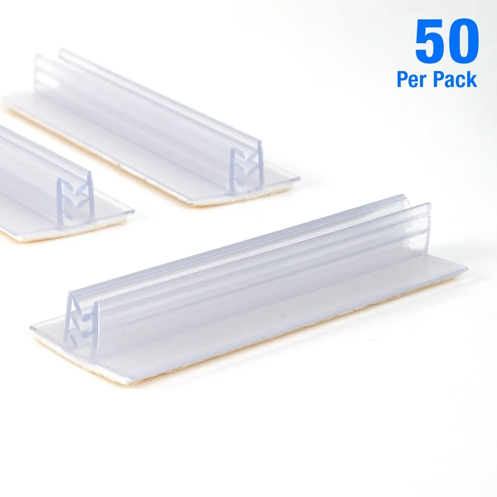 The adhesive sign holder, sign clip is 80mm long and has a wide base as well to help provide ample support. The centre channel of the holder has a gripping teeth design, securely holding signs that are placed into display. The simple design ensures signage remains in place whilst making changes take only seconds thanks to the firm grip. Each purchase includes 50 of the sign grips total to help you outfit your entire business!