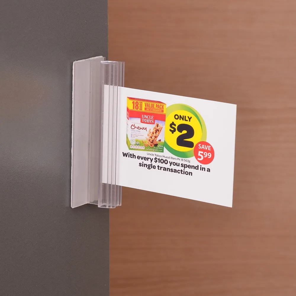 The POS price tag display, clip sign holder helps you display important information at your business for customers to see. The 75mm long display can hold signage of various sizes easily, with a wide support on each side of the centre channel to ensure stability. The centre channel uses an interlocking teeth design that securely holds signage in place whilst making it easy to switch out posters and adjust signs in the holder.