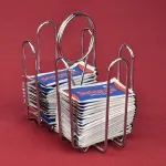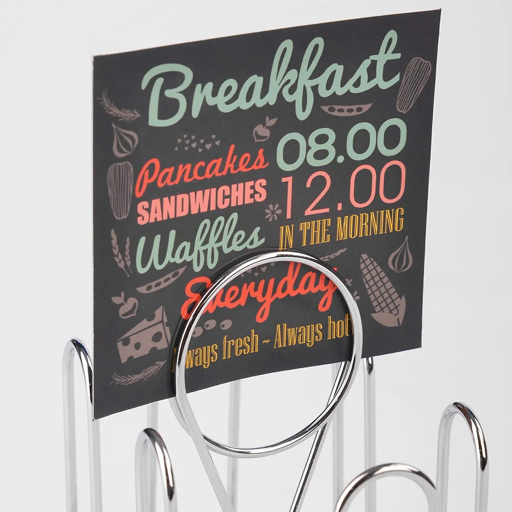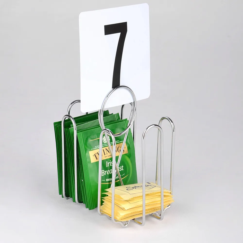 The table condiment holder is made of wire, providing a low-cost display that still provides a durable stand for years to come. Chrome plating provides a stylish look that looks just as at home at an upscale coffee shop as it does at a low-key cafe. Like many of our other hospitality displays, this stand features a number holder that helps employees and customers alike easily identify what table they are sitting at. The coil holder easily grips varying thicknesses of table numbers!