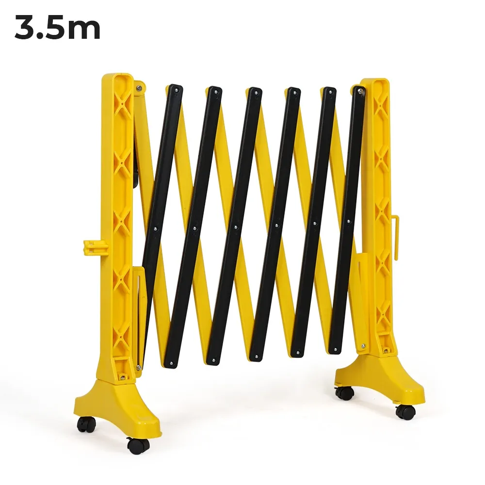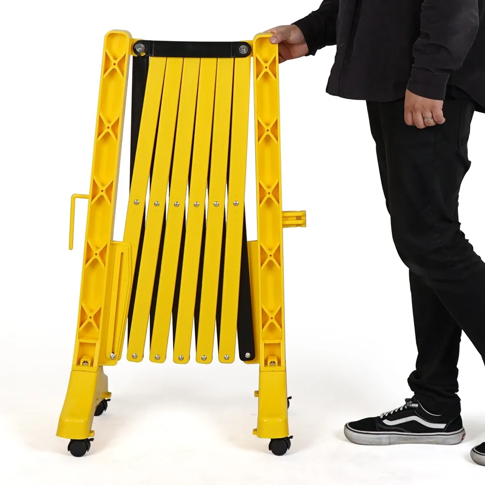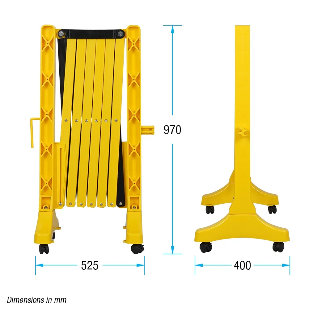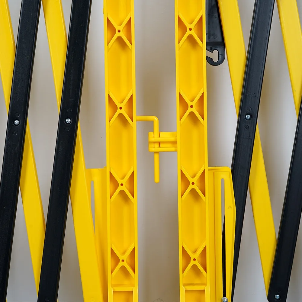 An expandable barrier, like portable barricades and portable safety gates, have a wheeled base to make putting it into position easy. Each of the four wheels rotate 360° for full maneuverability and are lockable to keep the gate in place once in position. The middle cross bars form a diamond pattern, with alternating yellow and black for a contrasting design that increases awareness of the area people should not enter. The diamond pattern gate is 530mm high when fully extended to make climbing over to enter an area harder whilst being easy to see.