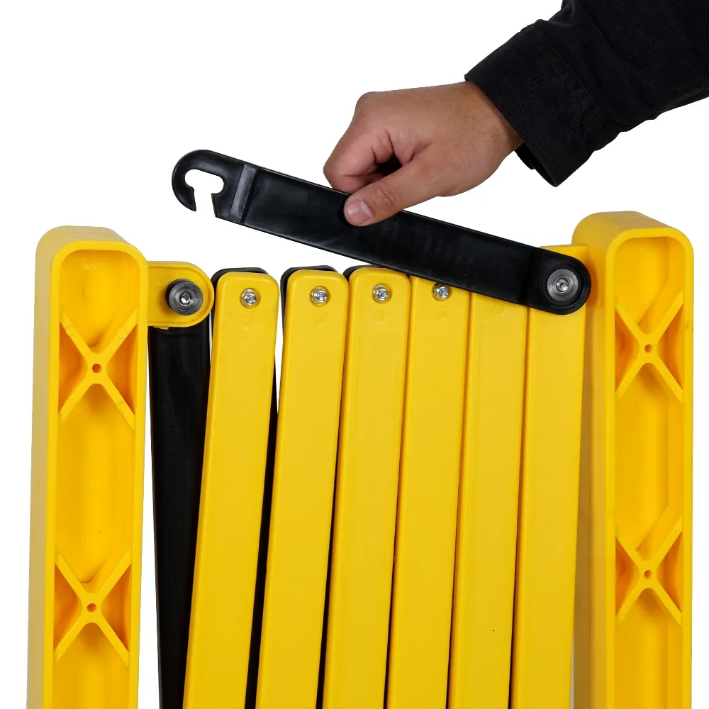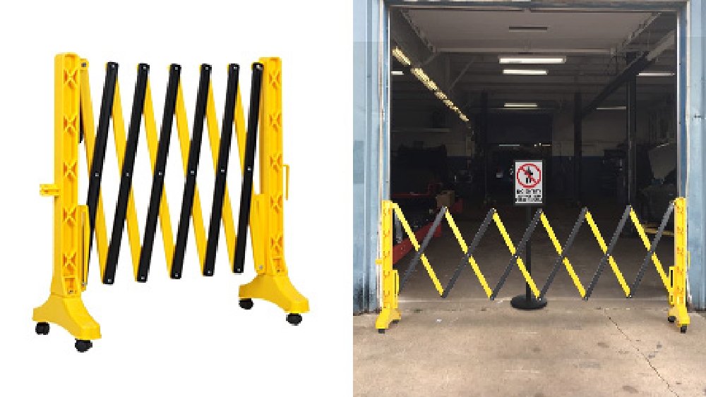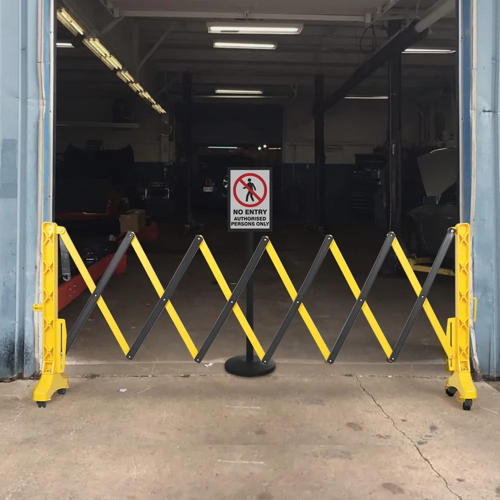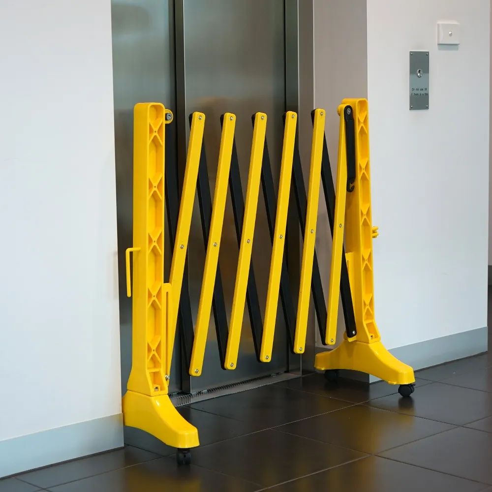 An expandable barrier, like portable barricades and portable safety gates, have a wheeled base to make putting it into position easy. Each of the four wheels rotate 360° for full maneuverability and are lockable to keep the gate in place once in position. The middle cross bars form a diamond pattern, with alternating yellow and black for a contrasting design that increases awareness of the area people should not enter. The diamond pattern gate is 530mm high when fully extended to make climbing over to enter an area harder whilst being easy to see.