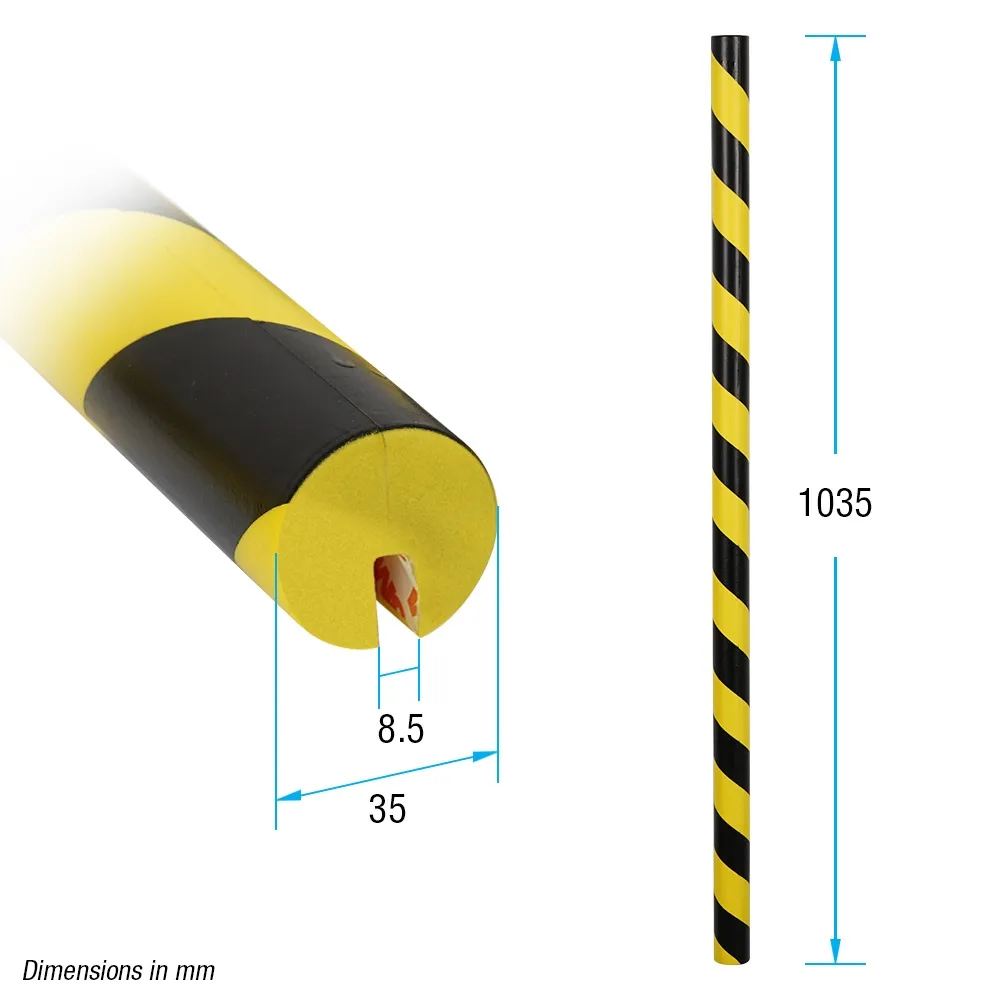 Foam impact protection is placed on warehouse racking and more to prevent damage to people or vehicles. The protector is cylindrical with a 35mm diameter, helping to prevent damage on multiple sides from a single installation. The guard is 1035mm long and is able to be cut to size to fit your specific needs. The warehouse bumper is great for protecting against sharp edges in warehouses, construction areas, loading zones, factories, temporary working sites and more.