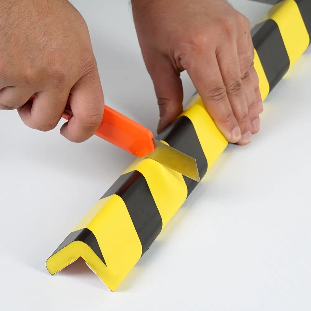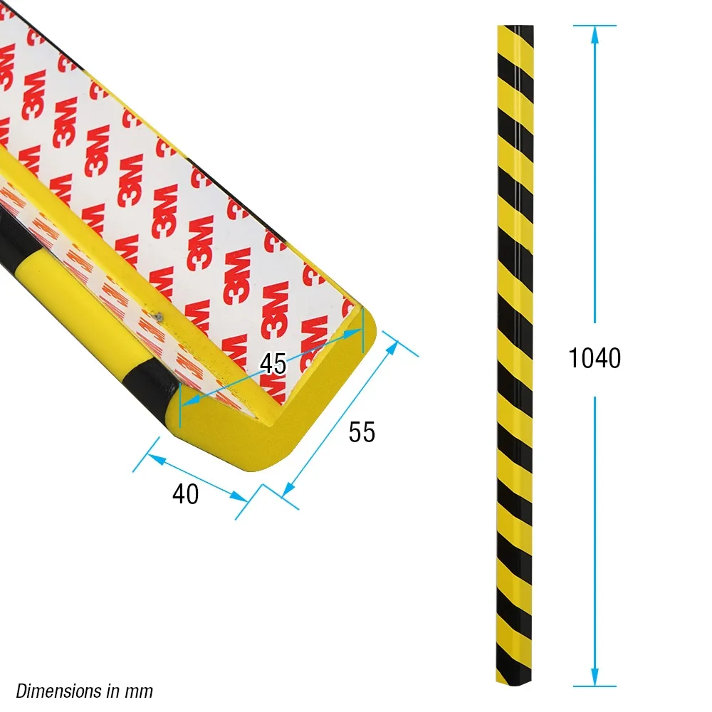 This foam impact protector is used to help prevent damage and injury. The corner guard is placed on pillars, warehouse racking, and more to prevent cuts from sharp edges and lessen damage on columns or pillars if they are inadvertently hit. The 1045mm length is great for covering a large area with a single bumper, and can be easily cut to length to fit smaller spaces as needed. The corner design is angled 90° and can be used on overheard racking as a head bump guard in addition to other placements. One side is 40mm wide and the other is 55mm to safely protect with ease.
