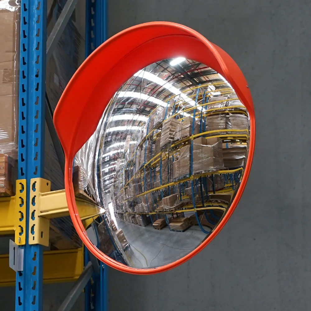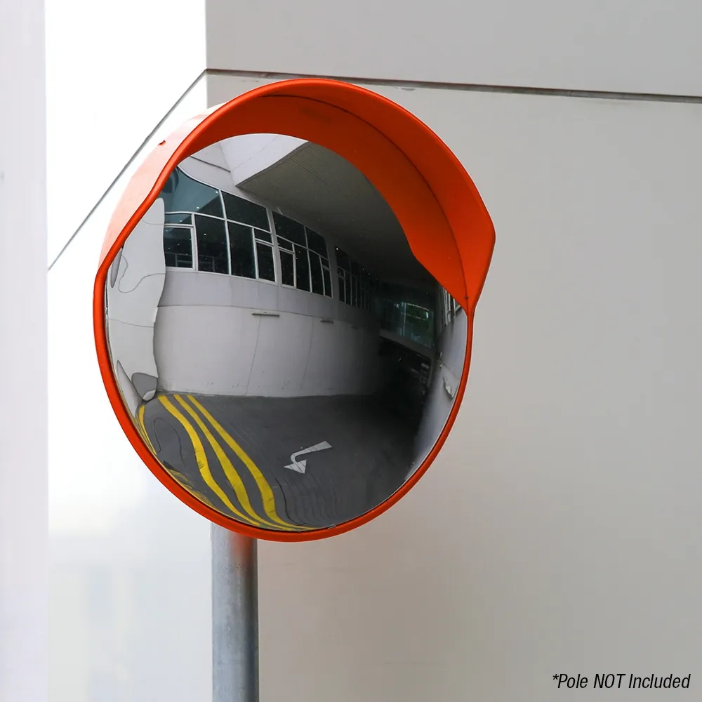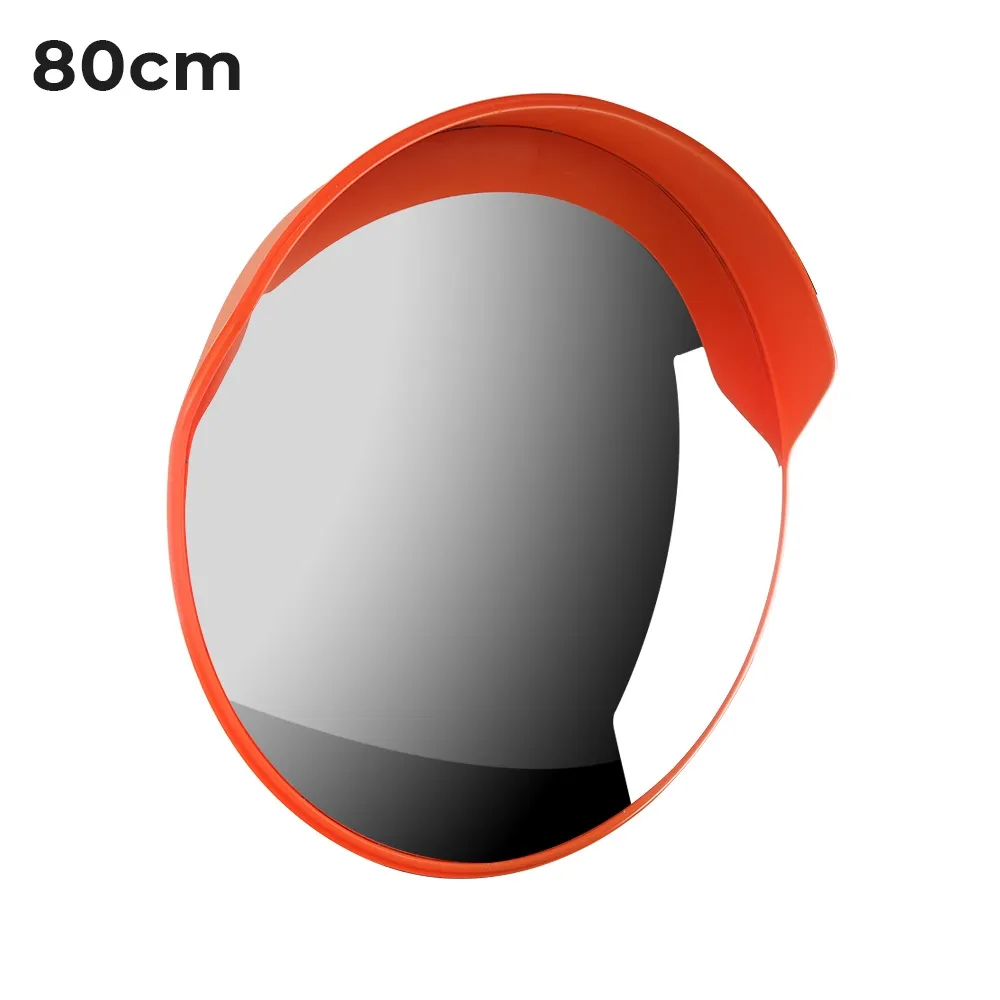 A convex mirror, safety mirror has a large 800mm size to fit atop poles, warehouse racking, and more. The majority of these mirrors, 750mm, is taken up by the reflective surface to maximise viewable area. The convex mirrors for corners are made from 3mm thick orange polycarbonate frame to be hard-wearing for regular use. This material allows both indoor and outdoor use to help prevent collisions anywhere. There is an extended hood on top of the convex mirror 80cm as well to prevent light from above from being reflected and hindering the view.