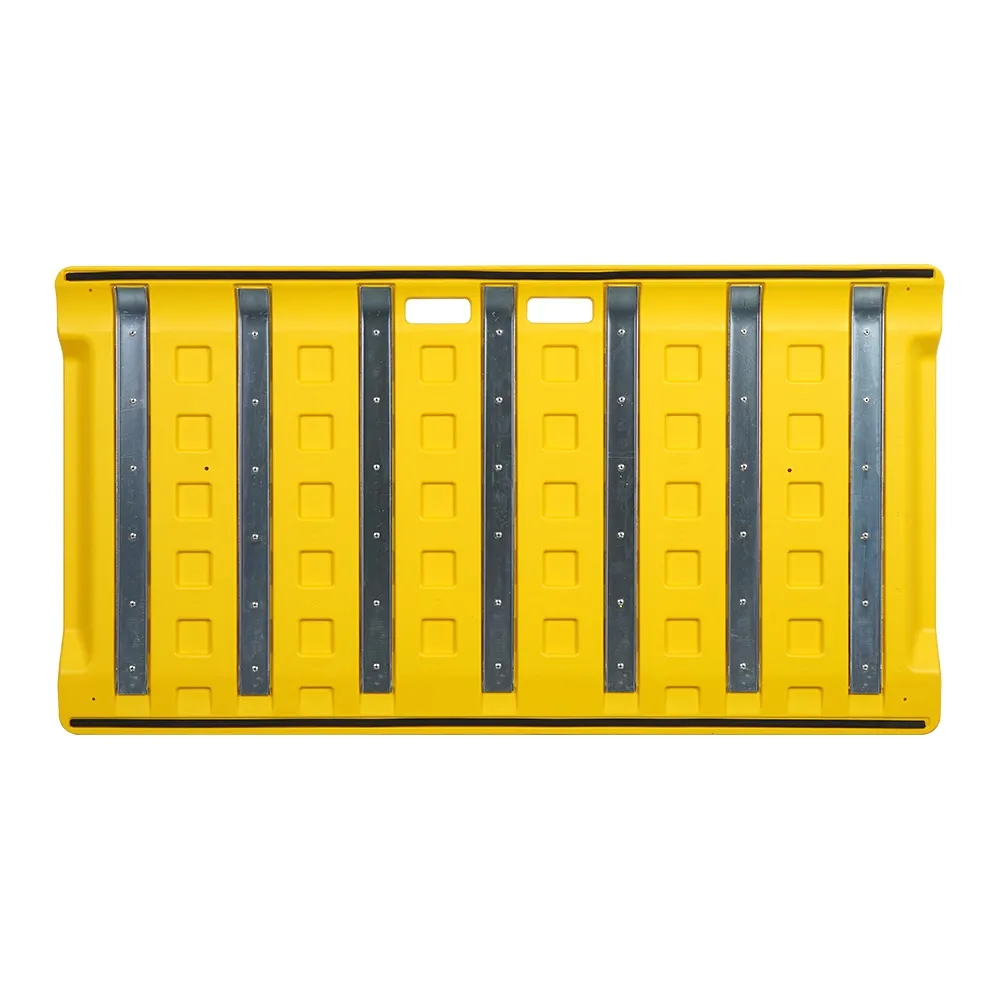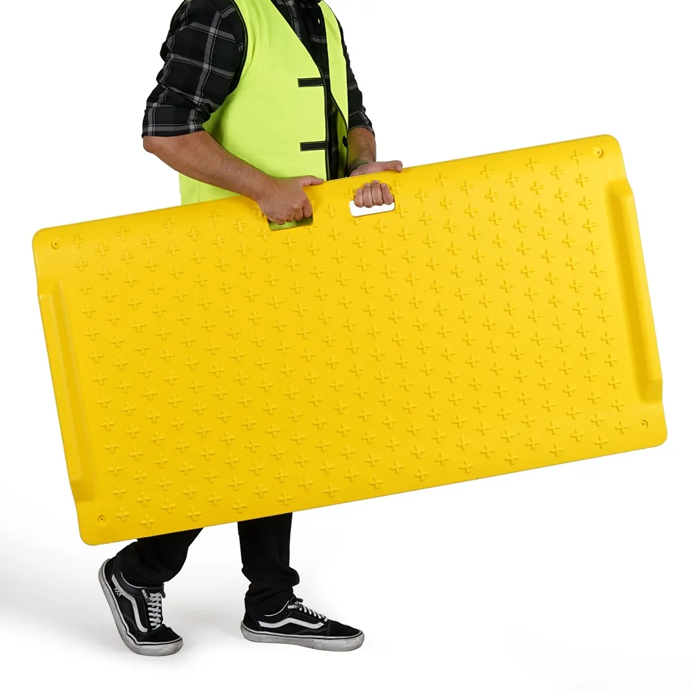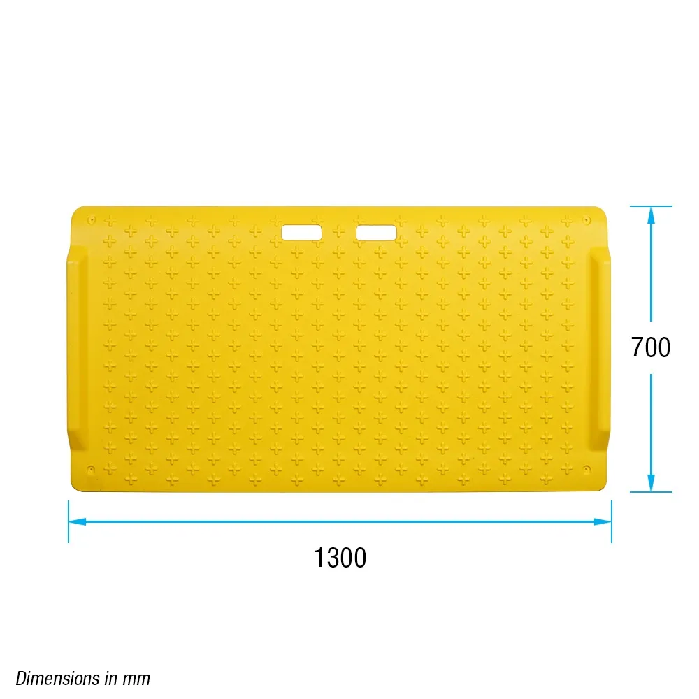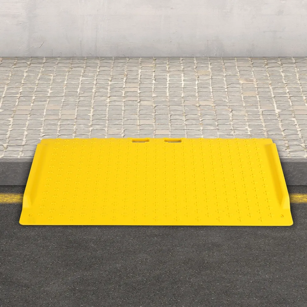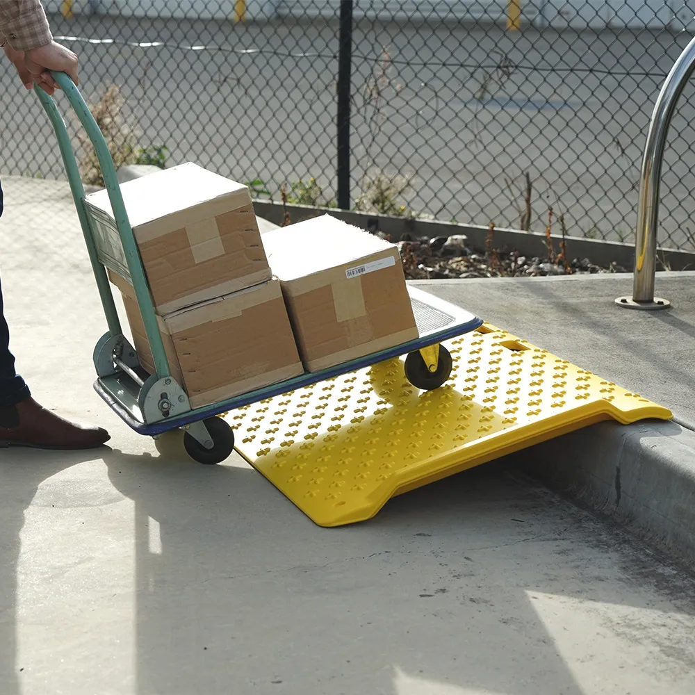 - Yellow HDPE plastic ramp has raised treads to provide grip