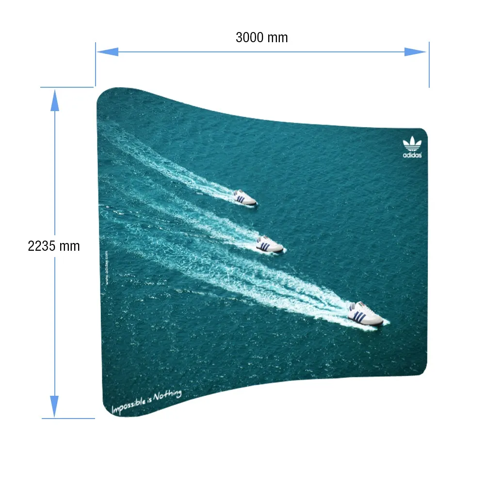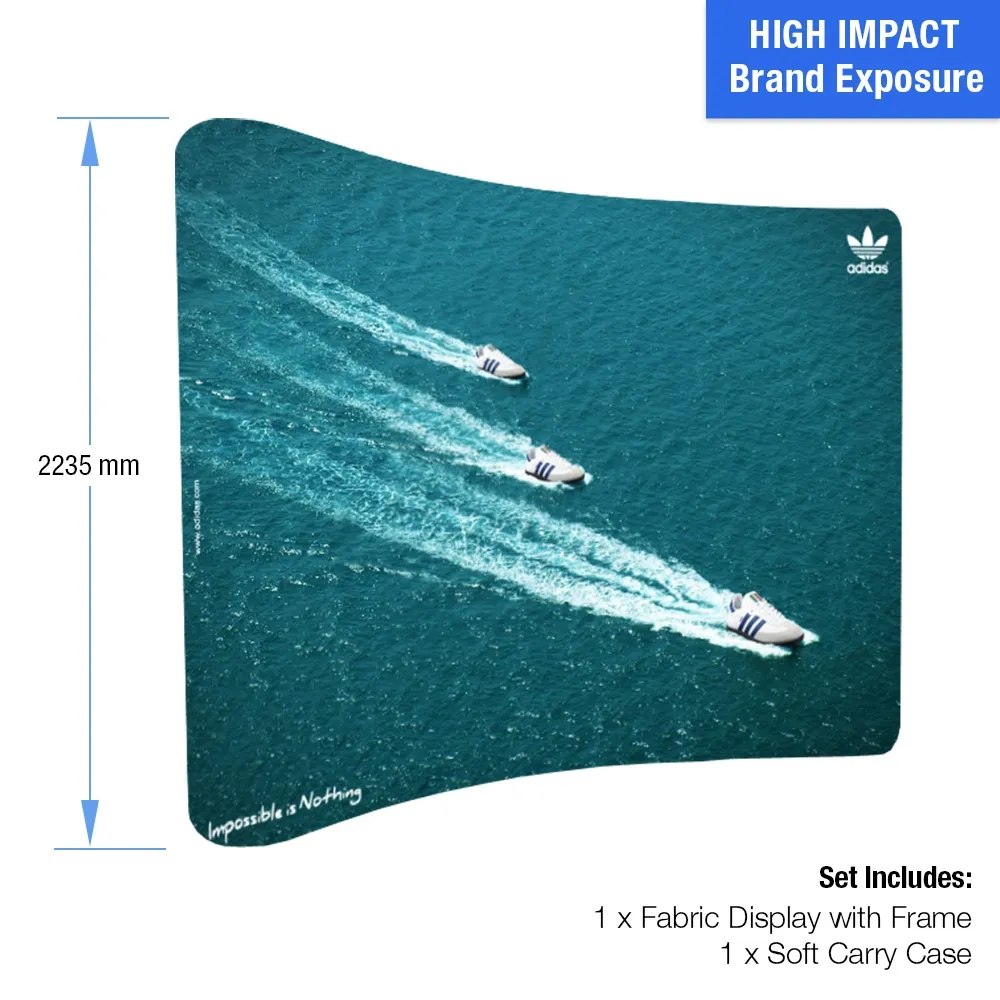 This pop up display, exhibition stand is 2.2m tall x 3m wide, providing an impressive backdrop to any tradeshow booth. These pop up exhibit displays feature digitally printed graphics on non-stretch polyester fabric using vivid colours to really make the unit call out to passersby. This exhibition stand prints with a dye-sublimation process, providing true to design printing that won't fade or peel over time, making exhibition pop up displays perfect for continued use without worry of deterioration. The pop up display is a great addition to any trade show booth, helping to draw customers in to your business to learn more.