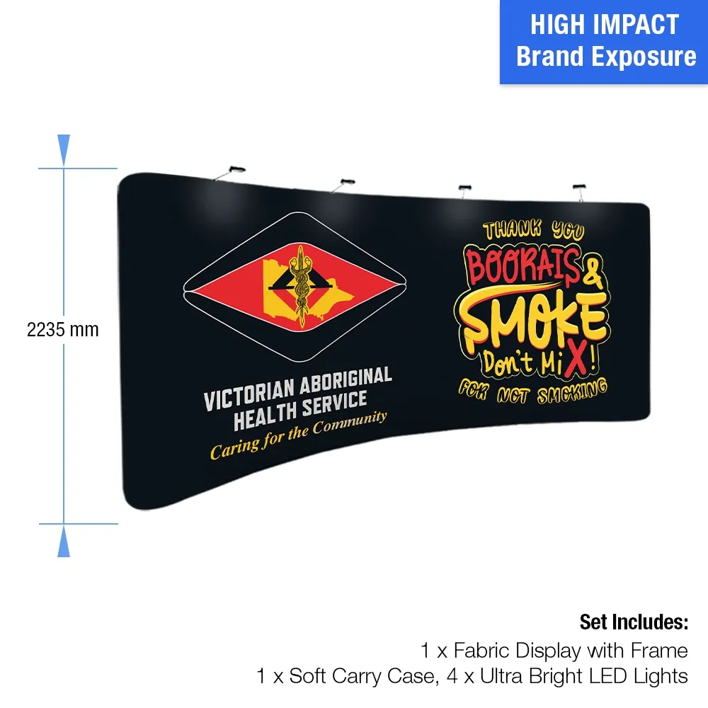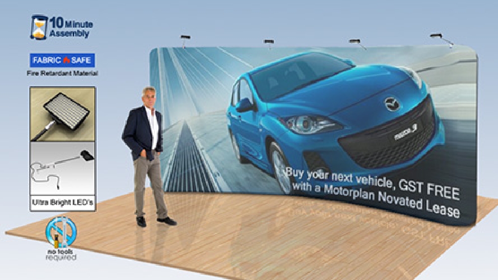 Booth display walls have your designs digitally printed in full colour, helping to draw attention to your area at trade shows, exhibitions, and more! The dye-sublimation process that is used with printing offers rich colours and vivid imagery that is a true depiction of your design. Our in-house team is available for design help as well, offering 3 tiers of service to provide you with the assistance that you need. The printing process that is used is hard-wearing, providing a fabric wrap that will not fade or peel over time to offer a great return on investment, allowing consistent use without deterioration! For transport between events, a soft nylon carrying is included that holds all components of the kit whilst ensuring the unit is protected when in storage in between uses. There are (2) bright LED lights included that attach atop the frame to illuminate areas of the backdrop to better draw attention. available that mount on the top of the fabric display.