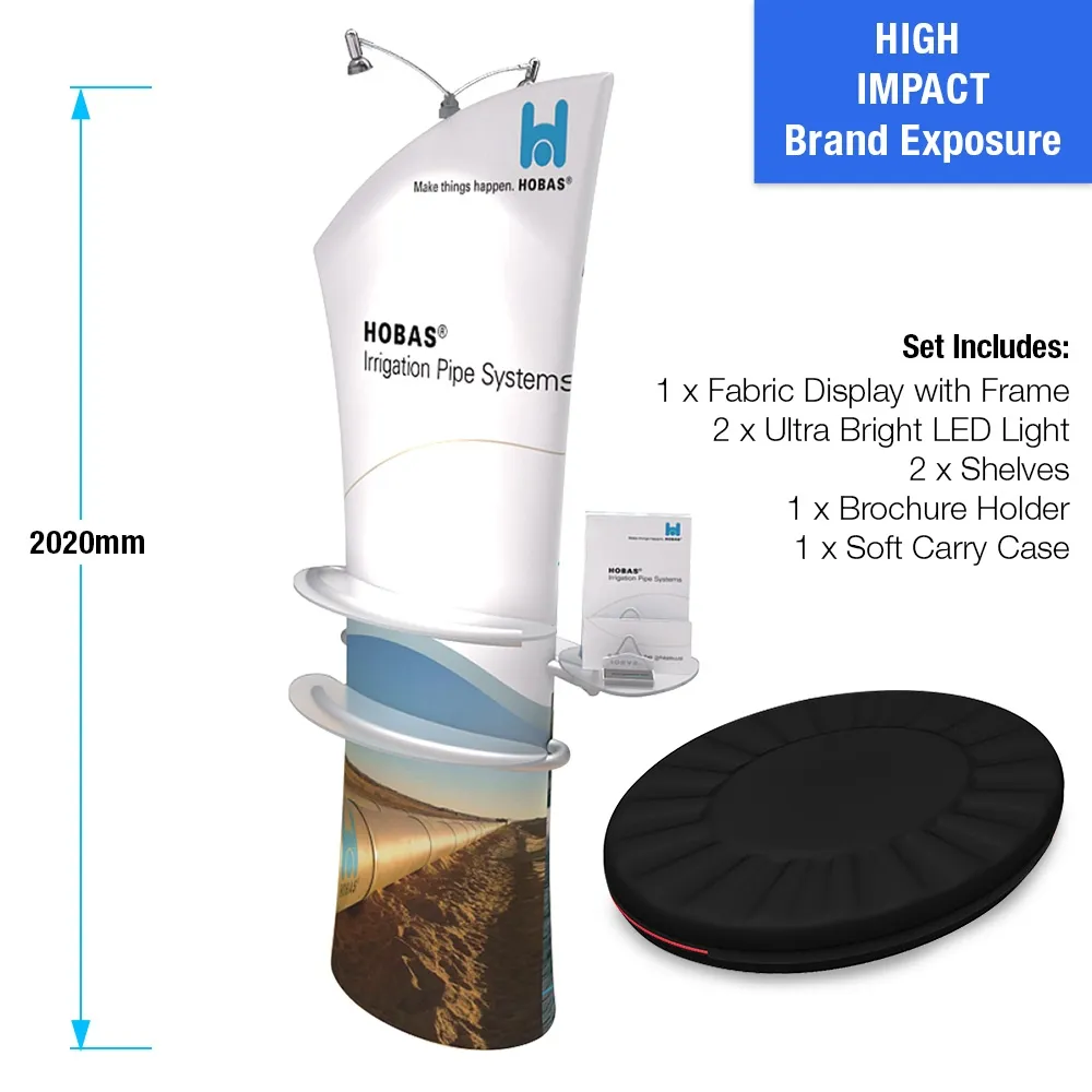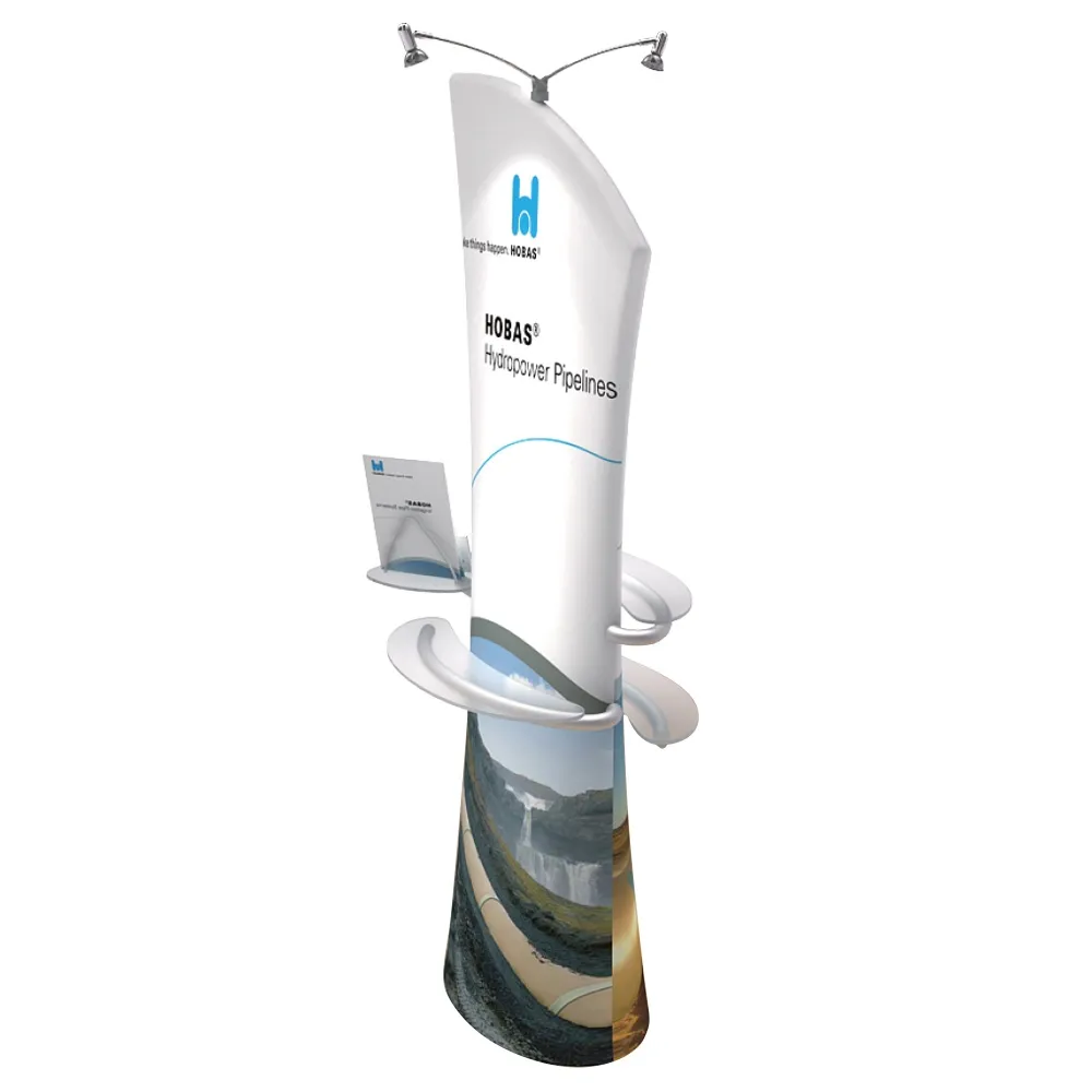 This display panel can be found at trade shows, exhibition halls, retail stores, and information centres. These displays exhibits feature fire retardant material that is printed with a dye-sublimation process. This allows your custom designs to show in all of their splendor, using a true-colour process that will not fade or peel over time allowing for continued use. The display panel has frosted plexi-glass shelves included that can optionally be used. Each shelf can hold up to 2.3 kgs of merchandise or products. The side shelf has dividers, perfect for informational materials, catalogues, and business cards for easy access for patrons. The seamless exhibition stand is double-sided to be seen by more people in any location.