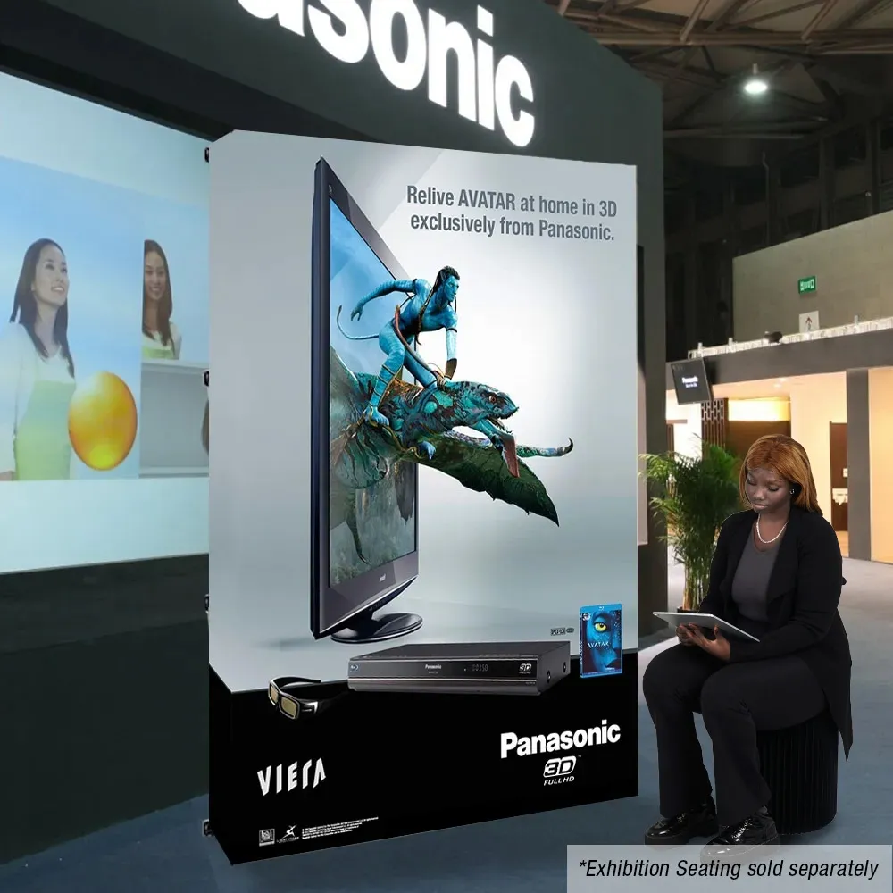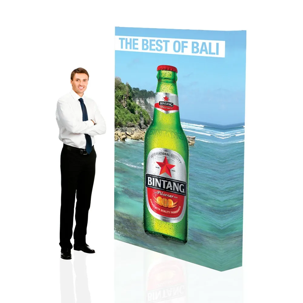 The display exhibit features your custom designed graphics that help identify your business or advertise products at trade shows or exhibitions. The promotion counter, exhibition trade show uses a dye-sublimation process, that presents your designs in vivid full colour that will not fade or peel over time, even with continuous use. This display exhibit uses a wrap-around design, allowing your image to be also seen on the sides of the stand. The exhibition trade show is 2.2m x 1.5m, easily seen in any location, making it perfect as a backdrop at you next event!