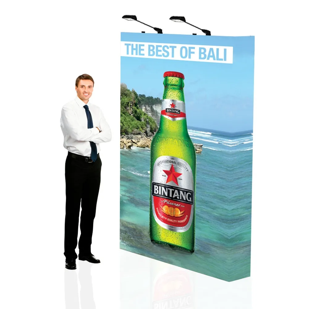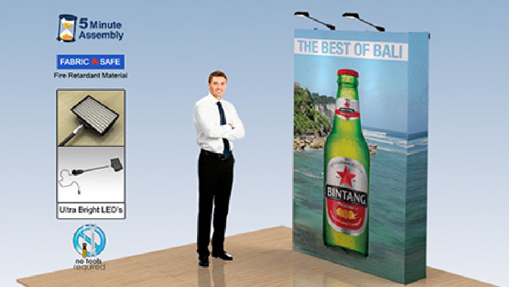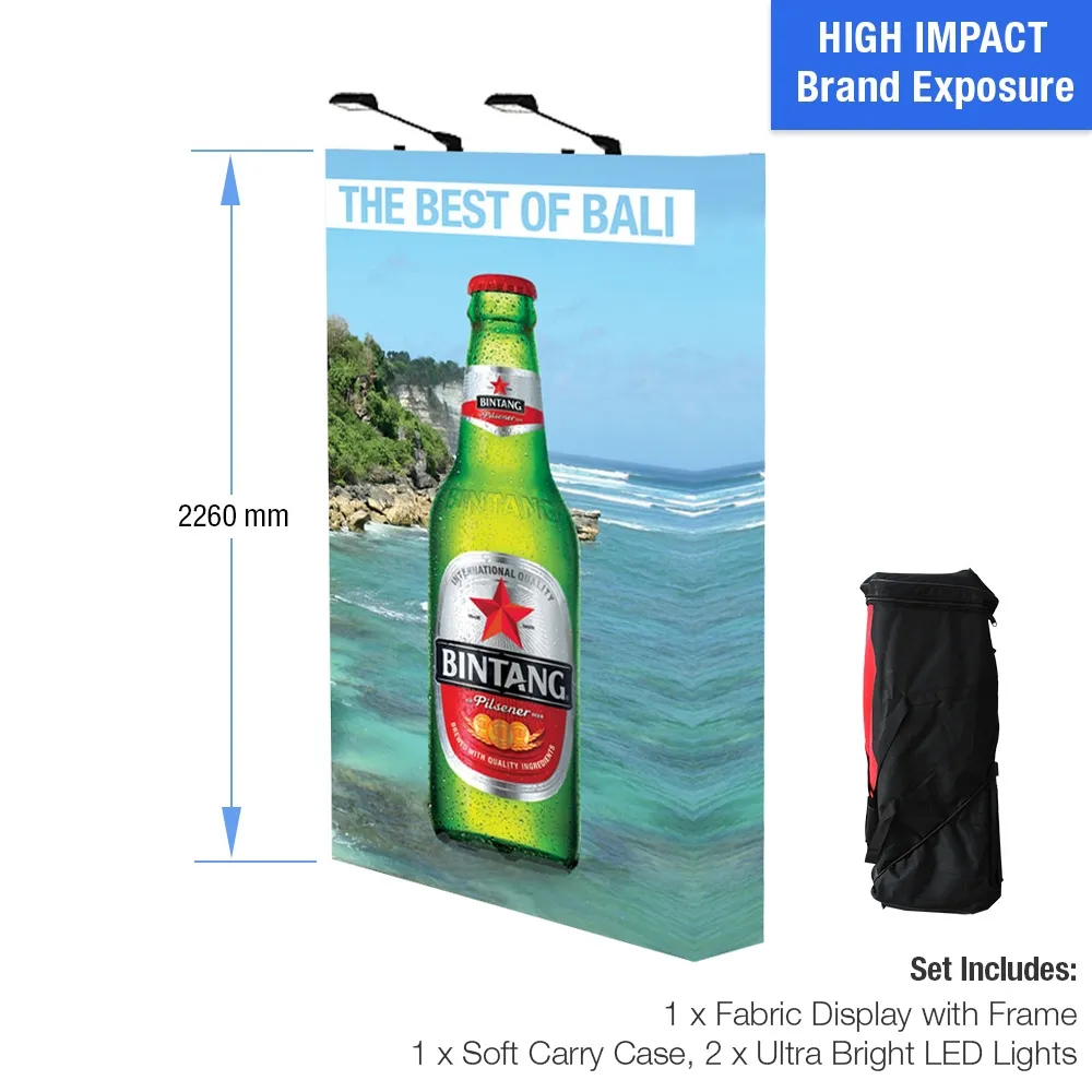 The pop up backdrop is great for trade shows, exhibitions, retail stores, information centres, and more to help identify your business and draw the attention to your business to help gain new customers! Your designs are digitally printed directly onto the fabric using a dye-sublimation process that offers rich colours and vivid imagery of your designs, with graphics extending to the sides to help hid the frame. If design help is needed, our in house graphics team is available offering three tiers of assistance to help you finish your ideas with the right amount of help. The 2 x 3m size of this exhibition display is great for trade show booths or general store areas, making it an ideal back drop for a number of locations. There are (2) LED lights included that use extended arms to shine down and illuminate the graphic for higher visibility!