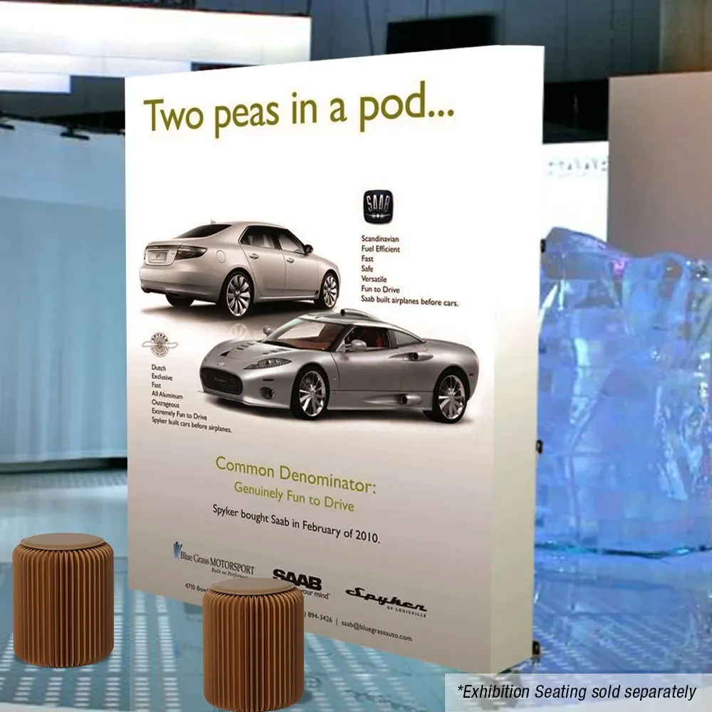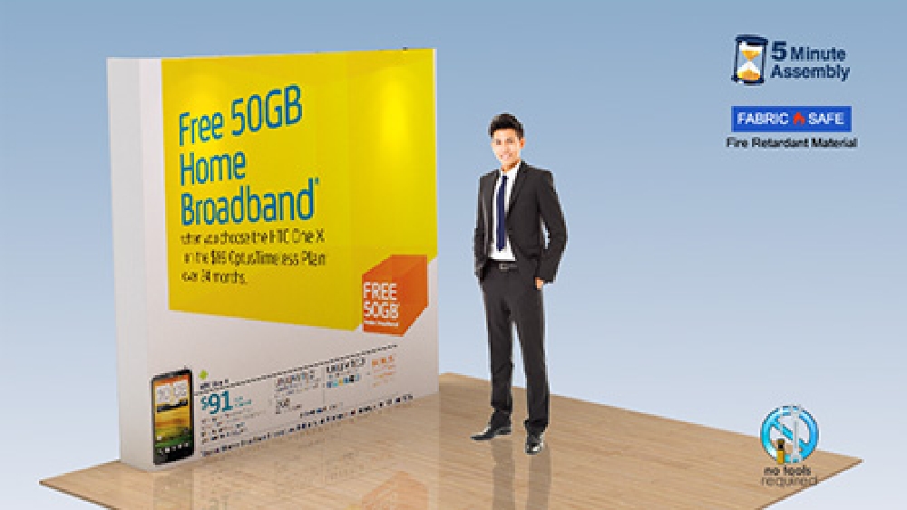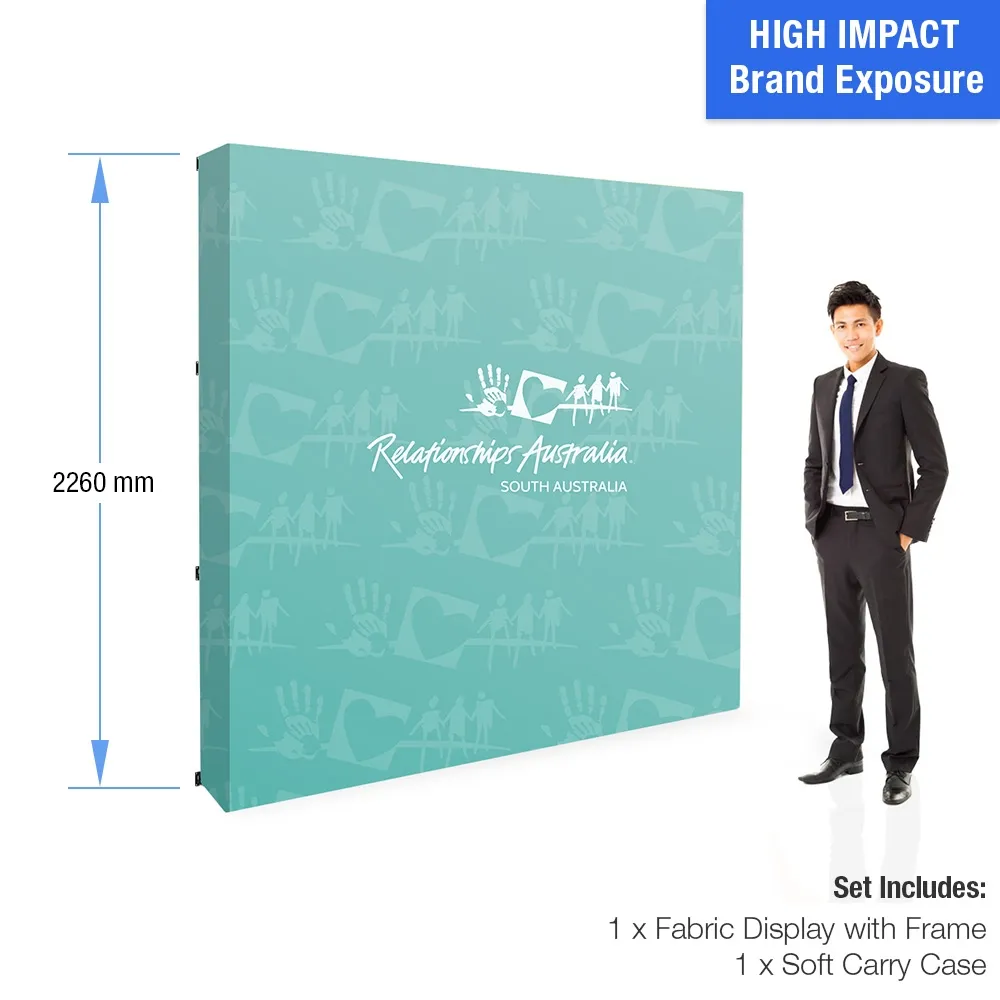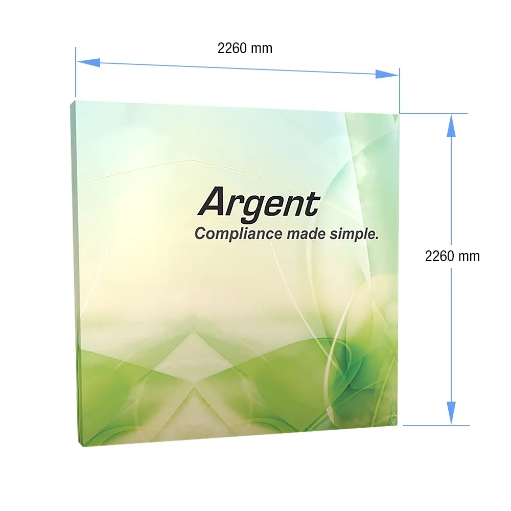 Display panels have your custom designed graphics brilliantly displayed on non-stretch polyester fabric, helping to make your exhibit booth stand apart from the competition. The show booth display uses a dye-sublimation process for printing, ensuring your graphics are vividly shown and will not fade or peel over time. These graphics wrap around the unit, providing a full display that also displays your graphics on the side with no aluminium frame showing. These trade show displays, display panels are large stands, measuring 2.2m x 2.2m to fit in your tradeshow booth and create an attractive back drop that will capture the attention of passersby.