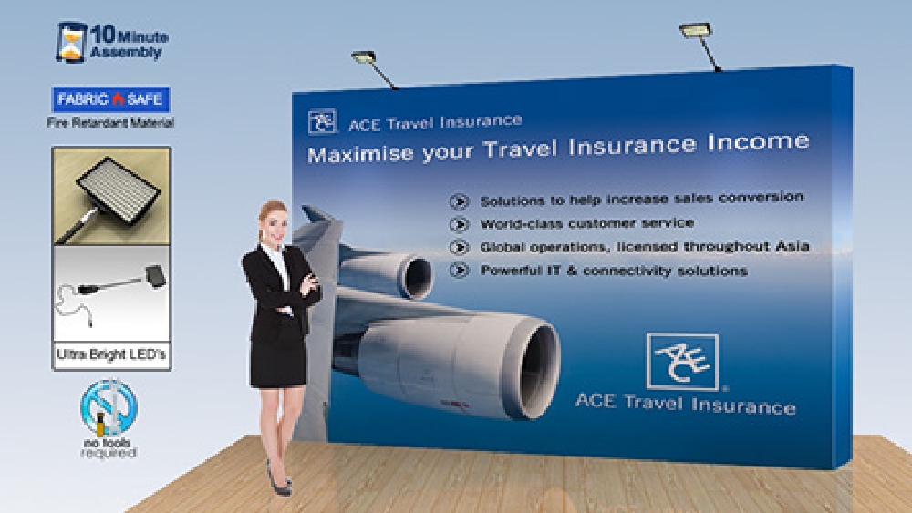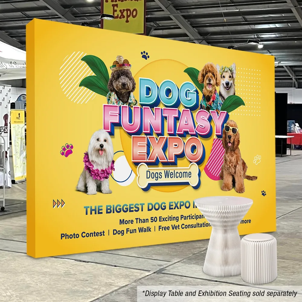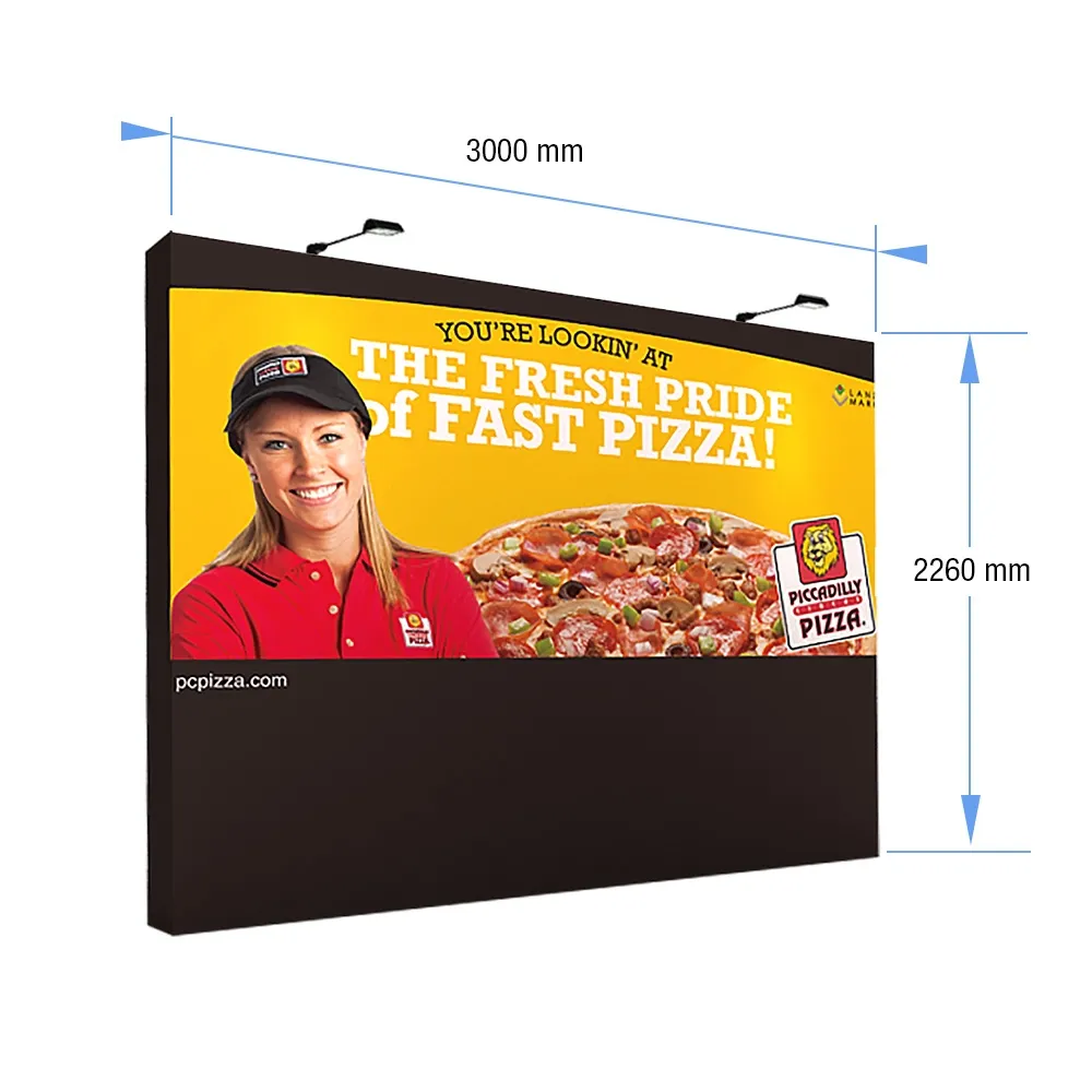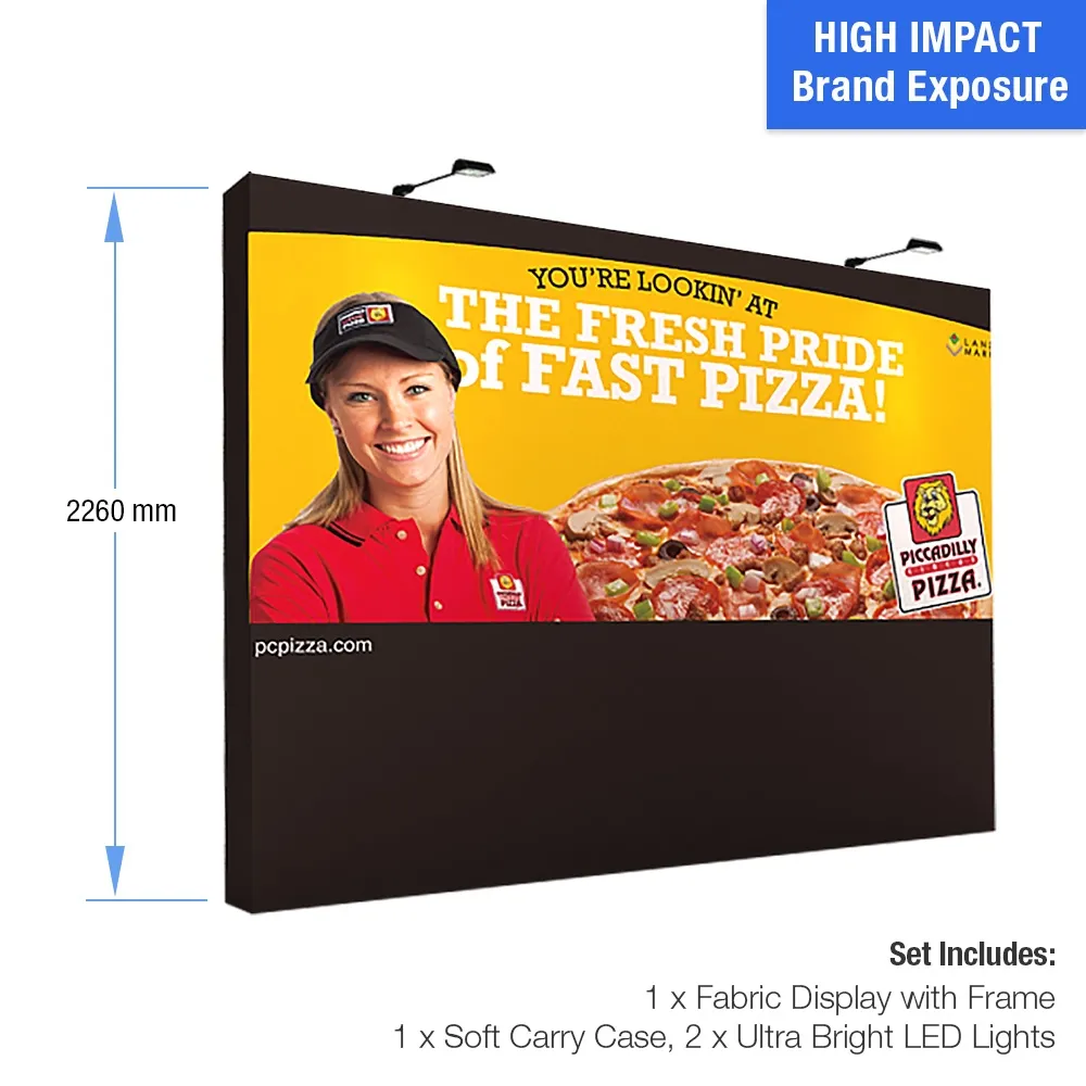 A tension fabric backdrop stand is great for trade shows, exhibitions halls, retail stores, information centres, and more to draw in passersby using eye-catching graphics and a large size that is highly visible. This display has your custom designs digitally printed in full colour with vivid imagery to better draw attention at events, with a dye-sublimation process utilised that offers a true depiction of your graphics. Our in-house team is available for design assistance as well, with three tier options to choose from to make finding the right one that suits your exact needs simple. The stretch fabric wrap has printing on the sides and front to help obscure the frame and offer a more professional look. The wrap is made from polyester that is machine washable and fire retardant for an easy to clean unit that is safe for use in any environment. There are (2) LED lights included as well that go on top of the frame and are at the end of extended arms to help brightly illuminate the display, making it easy to see the 2.2 x 3m unit from across a room.