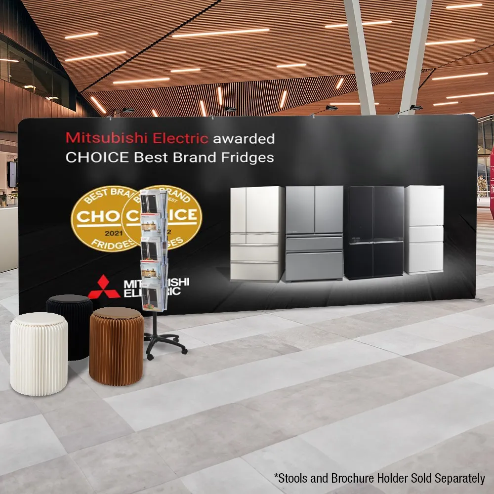 This printed backdrop uses a polyester wrap that has zippers, enclosing around the frame with an almost seamless design for a professional appearance. The fabric is machine washable to be easily cleaned between uses and fire retardant for safety whilst in use. This portable display uses a lightweight aluminium frame with snap together poles for quick set-up in minutes with no tools needed. The 15.6kg display breaks down fast as well to fit within the included nylon carrying bag that makes transporting the unit between events simple. This bag also helps protect the unit when in storage between uses, preventing grime or dust build up to make maintenance easier. Slimline Warehouse has quick shipping available nationwide with all of our 3000+ products, buy online today to use this expo display at your next even anywhere in Australia!