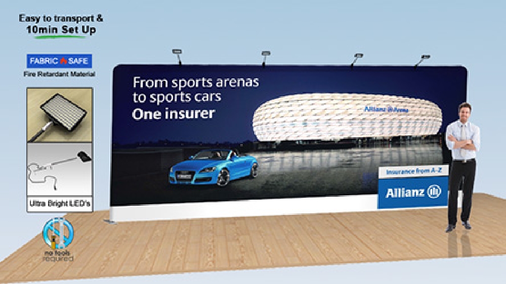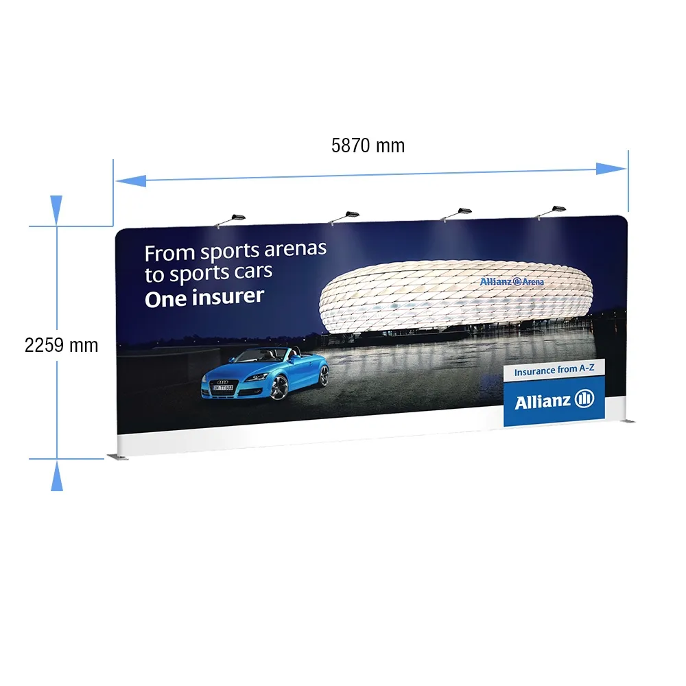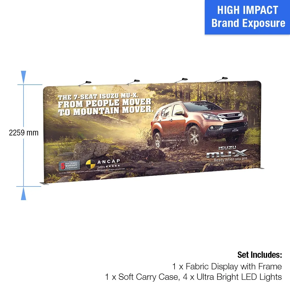 Use this printed backdrop at your next event to help draw potential customers to your booth to tell them about your goods and services. This style of display is great at trade shows, exhibition halls, information centres, retail stores, shopping centres, airports, and more. At 2.2 x 5.8m, this huge display is highly visible to help outshine the competition and better be seen at any event. The fixture is dual-sided as well, able to be seen in multiple directions at once to maximise visibility in different locations. The back drop has your custom designs digitally printed in full colour using a dye-sublimation process that offers true to design depictions of your ideas with rich imagery and vivid colours. Our in-house team is available for design assistance as well, offering three tier options to choose from to help you pick the right choice to align with your needs. There are also (4) LED lights included that illuminate the stand to really stand out among your competition!