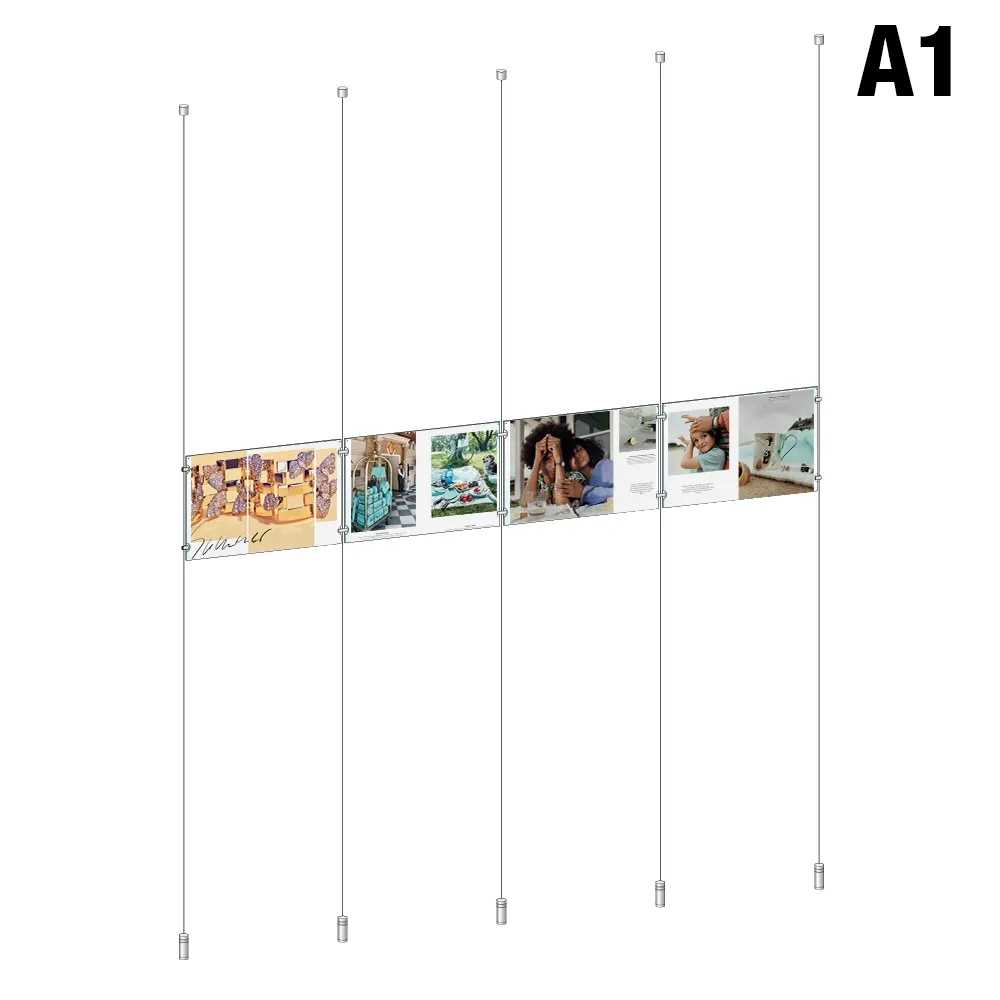 Use this floor to ceiling cable system to make it easy for passersby to see listings in a real estate agency window, create a dividing wall with advertising within museums or stores, and so much more! This kit includes all you need to create an impressive array of dual-sided poster holders that maximise display space. Each of the (4) acrylic holder panels is designed to display A1 (841 x 594mm) posters in landscape format. These panels have easy slide-in designs with tops that gently pry open for quick change outs. Embedded button magnets in the top of each help to keep them closed whilst on display!