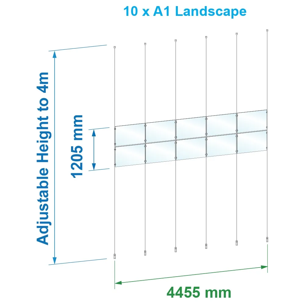 Use this cable display kit to advertise in store front windows or around retail stores using a stylish promotional tool that easily grabs attention! This unit has (10) individual poster holders that are made from clear acrylic and can have graphics placed on either side to maximise visual space. Each frame is designed for A1 (841 x 594mm) posters that are in landscape orientation, with a simple slide-in design making changing out poster easy. There are magnets embedded in the top to keep the holders from opening up whilst in use.