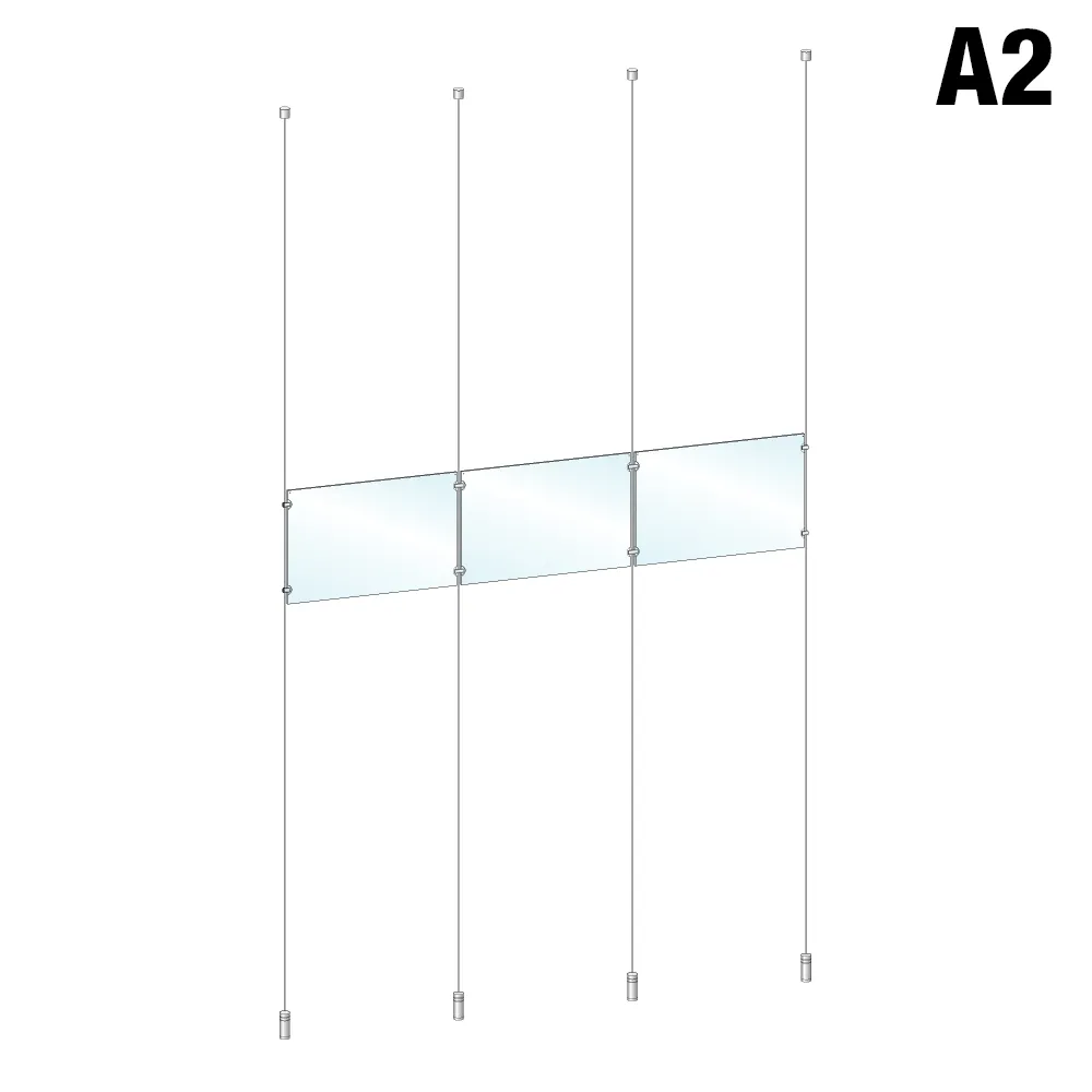 This A2 cable display is used in many businesses storefront windows to maximise poster display, where the dual-sided design showcases posters both inside and outside the business! The holders are arranged in a 1 x 3 array with clear frames made from 3mm thick clear acrylic. Each frame can display A2 (420 x 594mm) posters in landscape orientation and use a slide-in design that makes poster changes quick and easy with no tools needed! The small button magnets embedded within each side panel are used to keep the two sides together and keep posters in position.