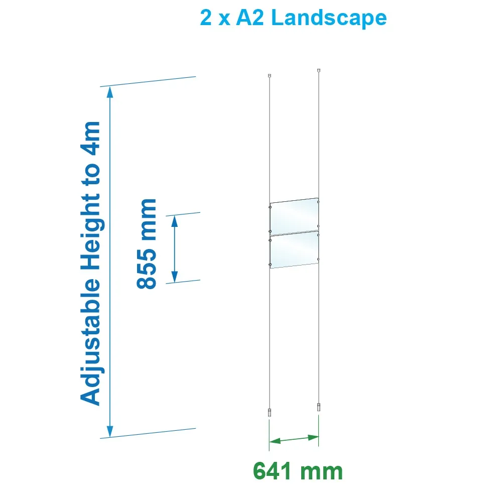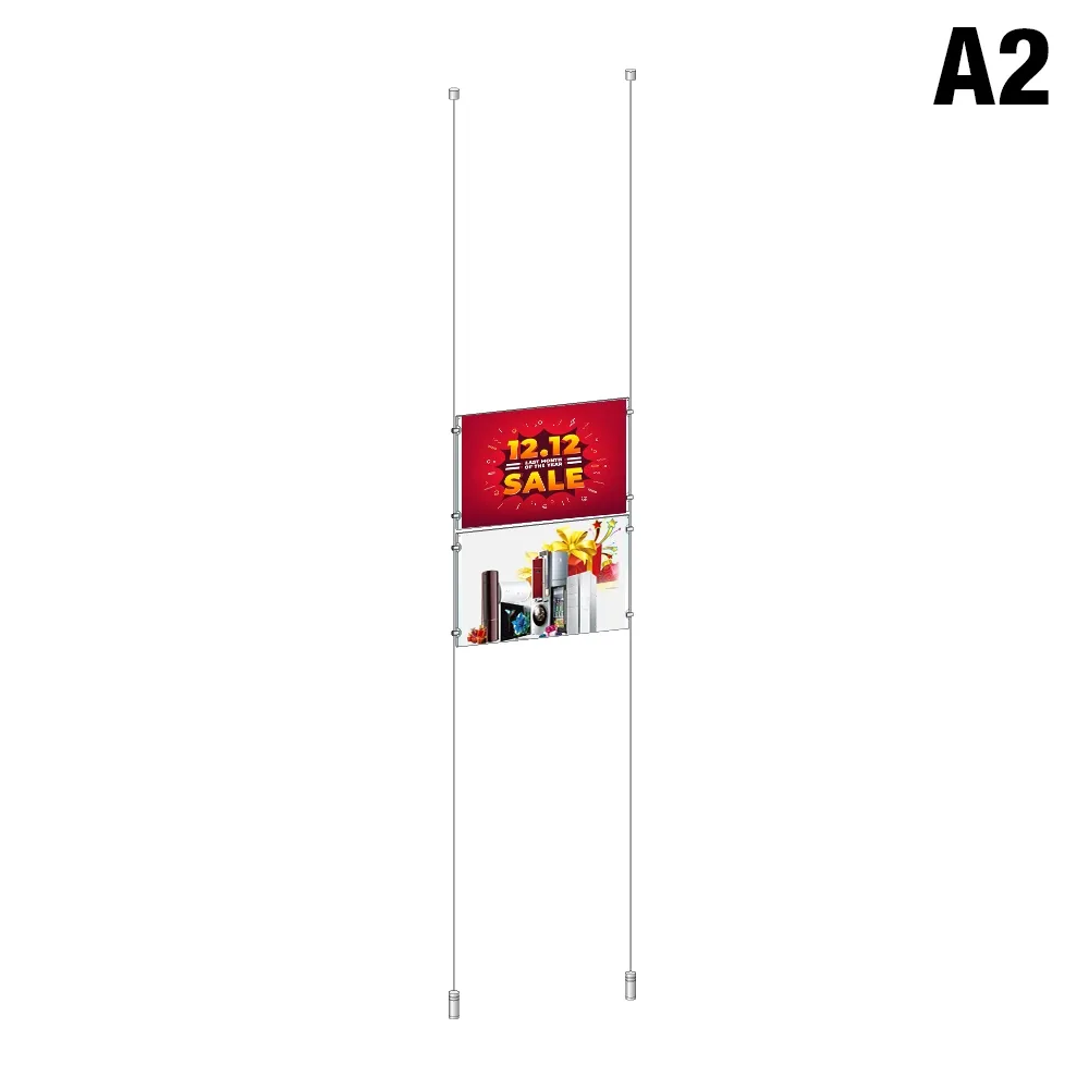 The wire display systems have 2 acrylic frames in a column that each display A2 (420 x 594mm) graphics in landscape format! These acrylic frames use 3mm polished acrylic, and have magnets embedded in the top. The hanging cable kits, wire display systems are dual-sided display to advertise in multiple directions at once. These units are used in real estate agencies, information centres, retail stores & more.