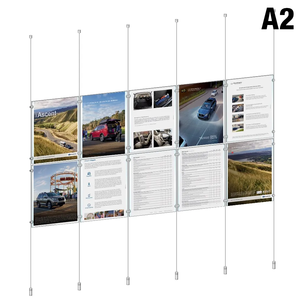 The real estate window display, like cable hanging systems, suspended the posters in the air with a series of standoffs and wires that create a floating effect that draws attention of passersby! There are (6) wires included that are all 4m long and can be cut to size to fit the span of almost any floor to ceiling distance! The top and bottom fittings can be hand-tightened to quickly ensure wires are taut and maintain the professional appearance. Standoffs and joiners use an edge grip to attach the clear holders to the wires and each other securely. Slimline Warehouse has same day shipping available with this and most other in stock products if purchased by 3pm EST, buy online today for fast dispatch Australia-wide!