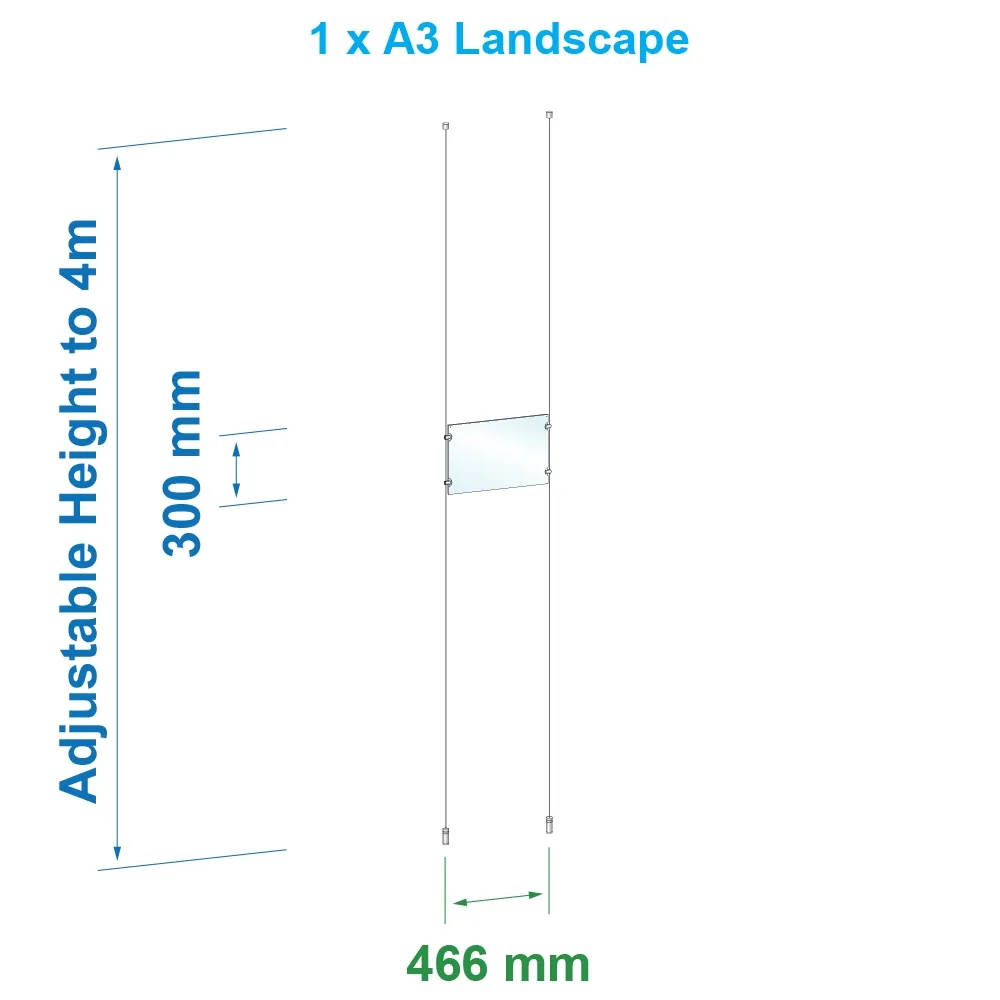 Cable hanging systems have landscape A3 frames that are made from 3mm acrylic. There are embedded magnets in the acrylic that help keep the frame closed and your custom graphic in place. These wire display kits, cable hanging systems are available with 1 to 5 frames across to fit the needs of different customers. These frames are doubled-sided to allow multi-directional advertising.