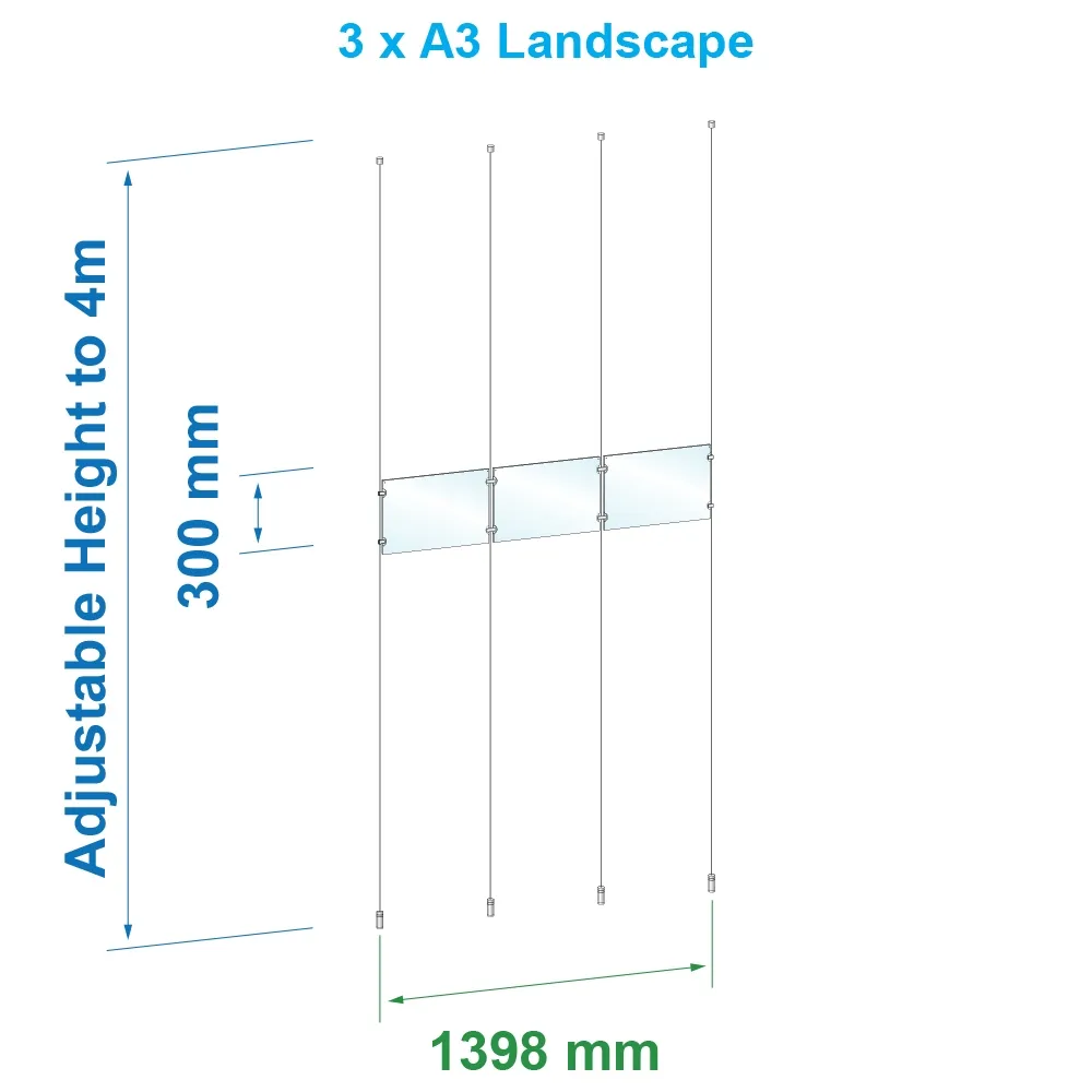 This A3 cable display is used in real estate agencies, museums, retail stores, information centres, and more to advertise posters in storefront windows or as dividing walls. There are (3) poster frames included that hold A3 (420 x 297mm) posters in landscape orientation on both sides, creating a dual-sided display that reaches multiple people at once from a single vantage point. The slide-in design makes it easy to change out posters in seconds without any tools necessary, as the two panels can be gently pried apart for access. There are button magnets embedded within the 3mm thick acrylic as well that help to keep the sides together and prevent posters from moving out of place.
