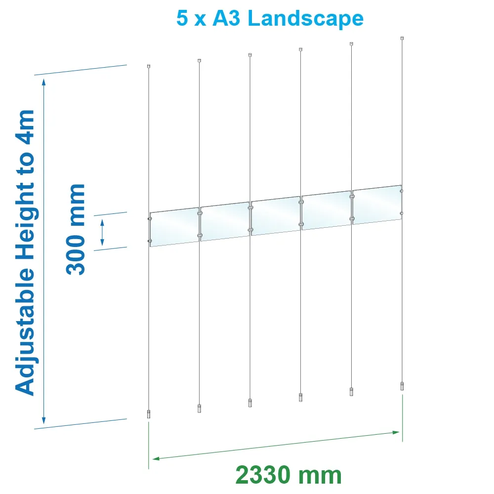 The window cable displays, stainless steel wire hanging systems suspended these frames between the floor and ceiling using six 4m long steel cables that can be cut to size to fit your needs. The edge grip standoffs and joiners attach the frames to each other and the cables securely to create 1 x 5 panel array. The floor and ceiling fittings are hand tightened to ensure each cable is properly taut for a professional look. Slimline Warehouse provides same day shipping Australia-wide with this and most other in stock products if bought by 3pm EST, buy online today!