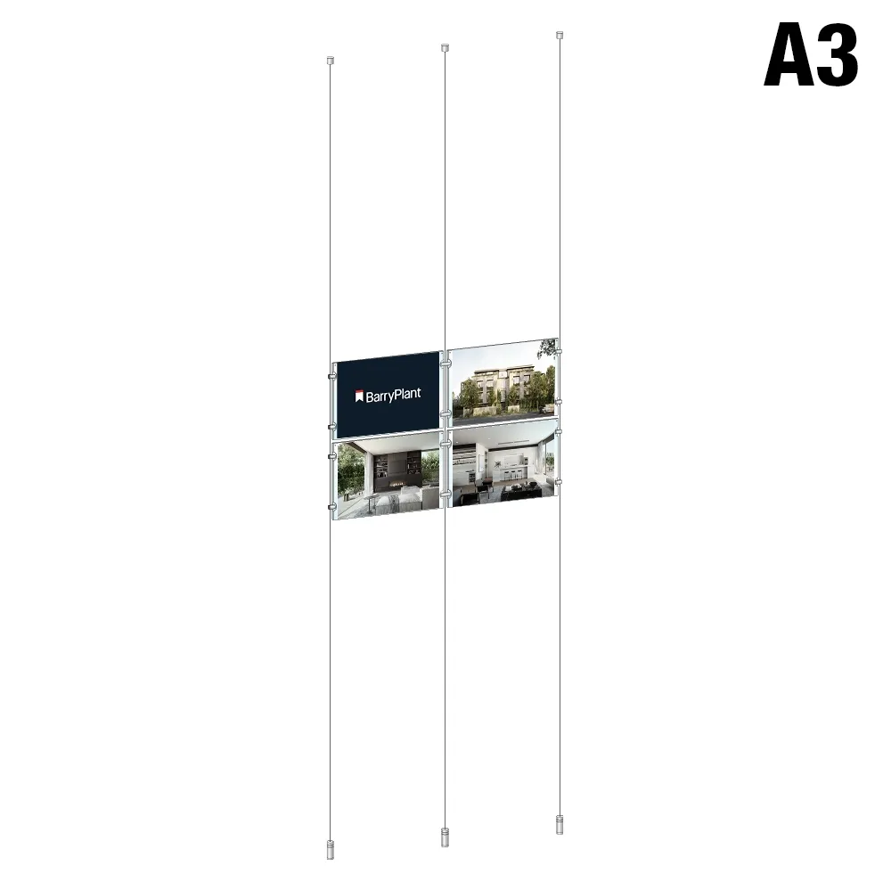 The window display real estate, like hanging cable signs, has stainless steel wires that suspend the frame between the floor and ceiling. There are (3) 4m long cables included that can be cut to size to fit the span at your location, with the top and bottom fittings easily hand tightened to keep wires taut. The standoffs and joiners use an edge grip design to attach the frames to each other and the wires securely. Slimline Warehouse has same day shipping available with this and most other in stock products if purchased by 3pm EST, buy online today!