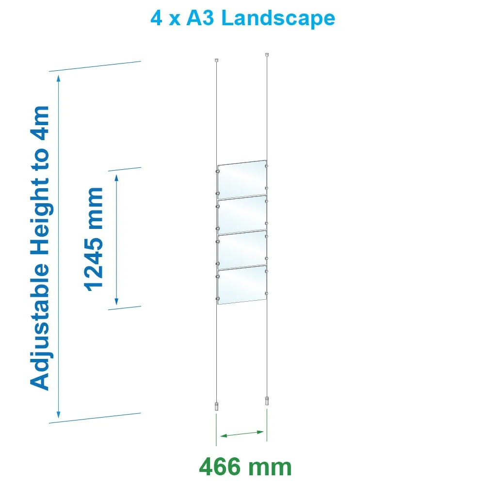 The wire kit displays, hanging cable systems allow from 4 up to 20 different acrylic frames to be displayed. These 3mm acrylic frames have magnets embedded in order to keep them closed and maintain a professional look. A single landscape A3 graphic fits in each frame. The hanging cable systems are double-sided to advertise in two directions at once. This is perfect for storefronts at businesses.