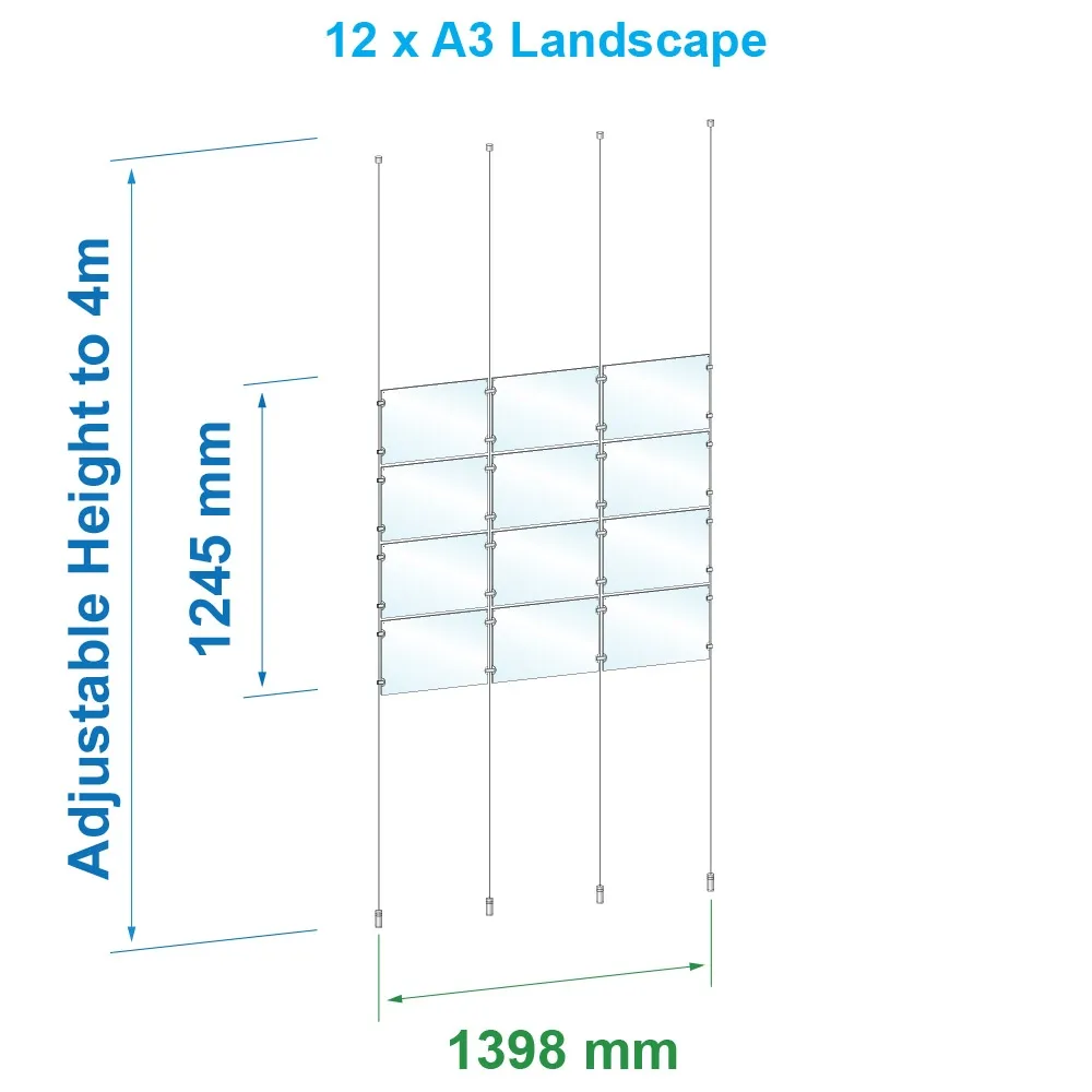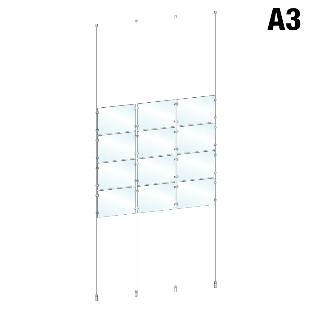 This cable display system has a eye-catching design that floats poster frames between the floor and ceiling to really draw attention! The kit uses (12) poster frames that are all dual-sided, displaying (24) total graphics in multiple directions creating an ideal storefront window display that's visible inside and outside your business. Each frame displays an A3 (420 x 297mm) poster in landscape format, with a slide-in design that makes switching out posters quick and easy with no tools needed. Small button magnets are embedded within each of 3mm thick clear acrylic panel to keep the frames shut and prevent posters from moving out of place.