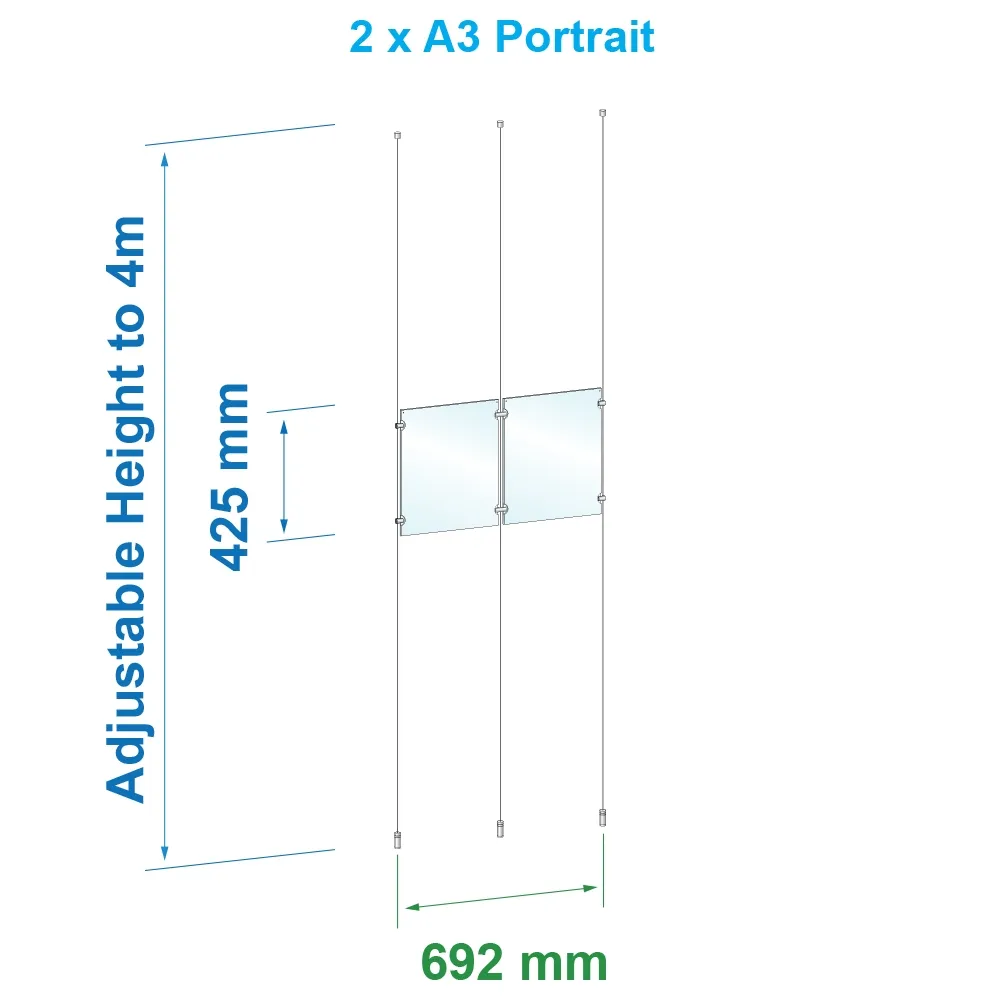 This cable display system is mounted between the floor and ceiling to create a floating poster frame effect that easily draws attention, perfect for marketing at retail stores, real estate agencies, information centres, museums, shopping centres, and more! This kit includes (2) clear acrylic frames that are dual-sided to maximise view, ideal for placement in storefront windows to reach people inside and outside your business. The poster holders are able to display A3 (420 x 297mm) standard sized posters that are in portrait orientation and the slide-in design makes it simple to change out posters with no tools necessary. The 3mm thick frames have small button magnets embedded within the panels to keep the from separating and helping posters remain in position.