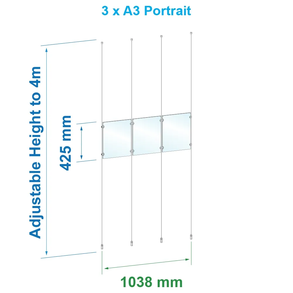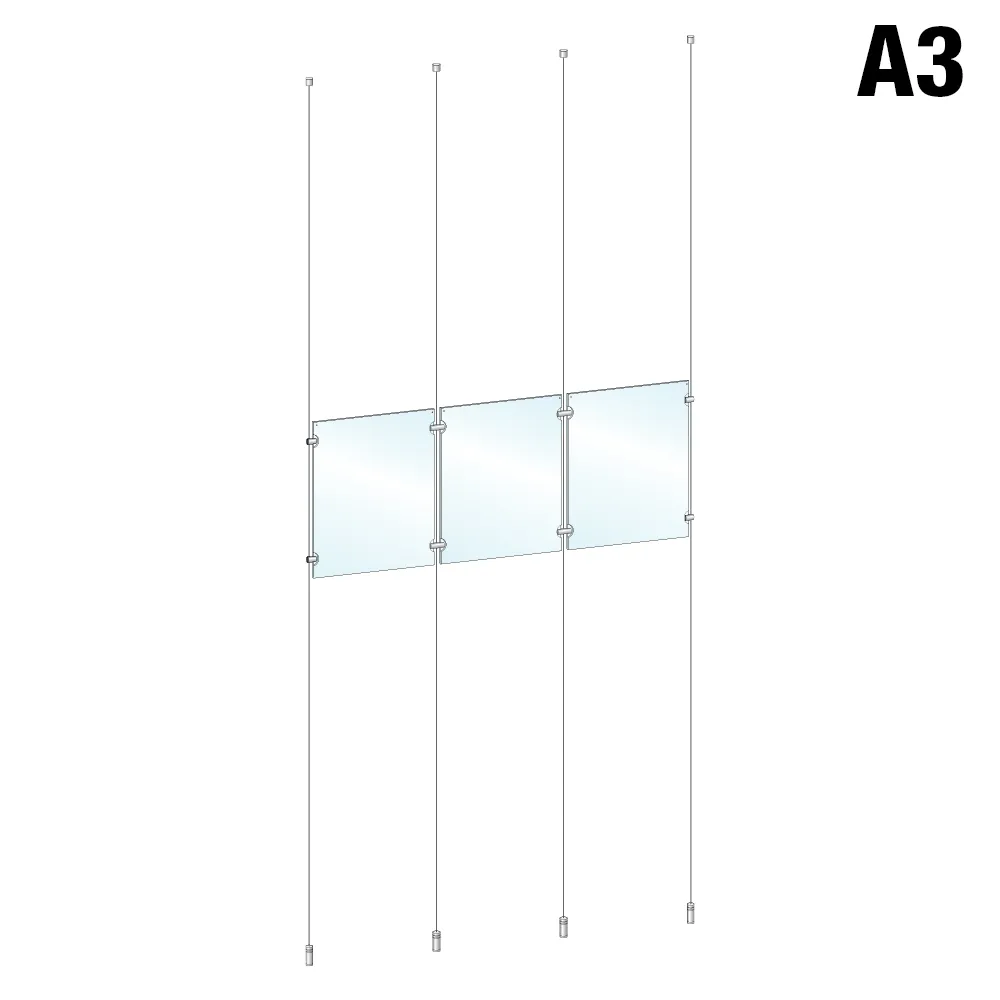 This A3 hanging wire system is used within a number of locations to create an eye-catching display that promotes sales and events, provides information, displays real estate listings and more! The 1 x 3 array has (3) clear acrylic frames with a dual-sided design that is perfect for placement in storefront windows where passersby both inside and outside your business can be promoted to with a single display. The posters holders display A3 (420 x 297mm) graphics in portrait orientation, with a slide-in design that makes poster changes easy since no tools are necessary to quickly switch graphics. The 3mm thick panels feature small button magnets embedded within to keep the sides shut and prevent posters from sliding out of place.