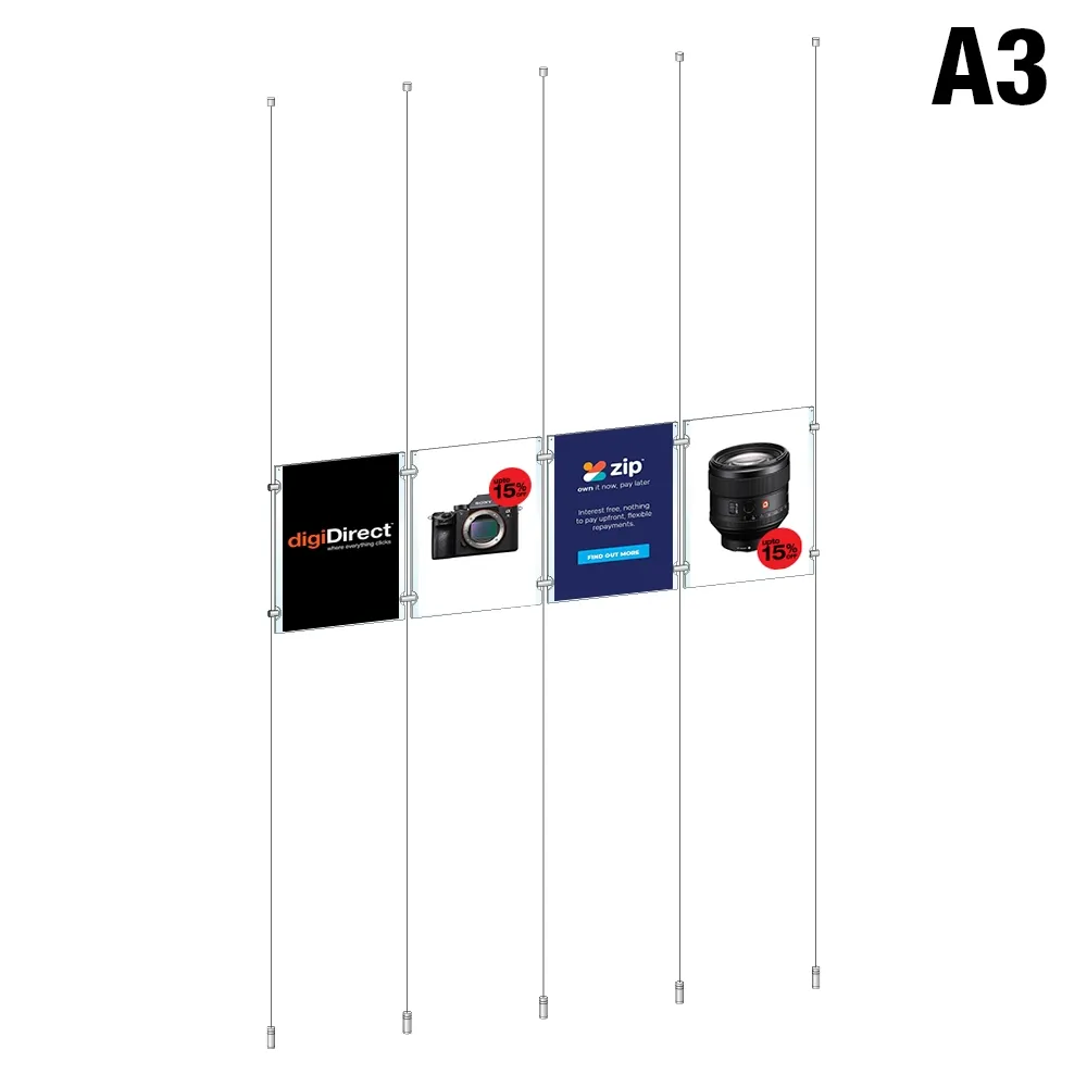 This real estate display, like hanging window signs, uses steel wires and standoffs to achieve the floating effect. There are (5) 4m long cables included that can be cut to size, making it easy to accommodate nearly any size span at most locations. The standoffs and joiners feature an edge grip design to securely attach the frames to each other and the wires, with the floor and ceiling fittings able to be hand tightened to maintain wire tautness. Slimline Warehouse has same day shipping available with this and most other in stock items if purchased by 3pm EST to anywhere in Australia, buy online for your business today!