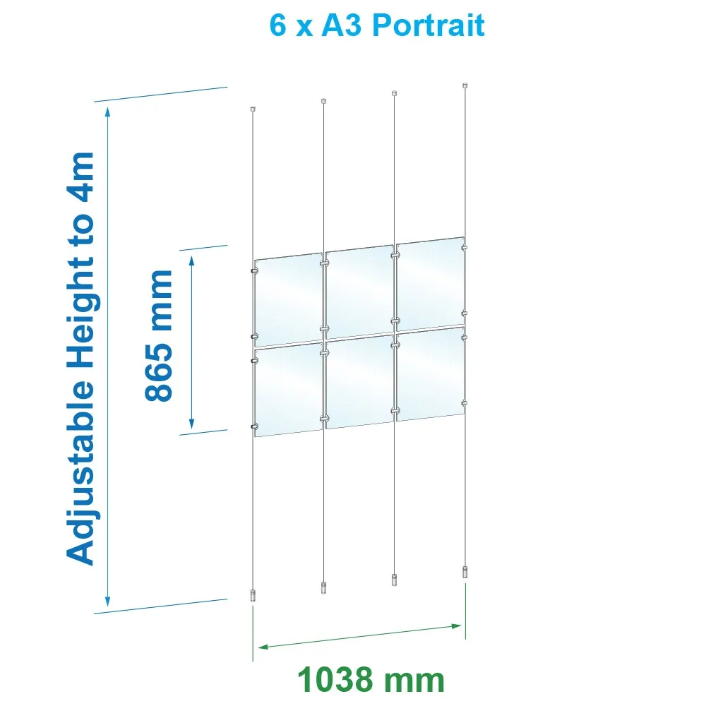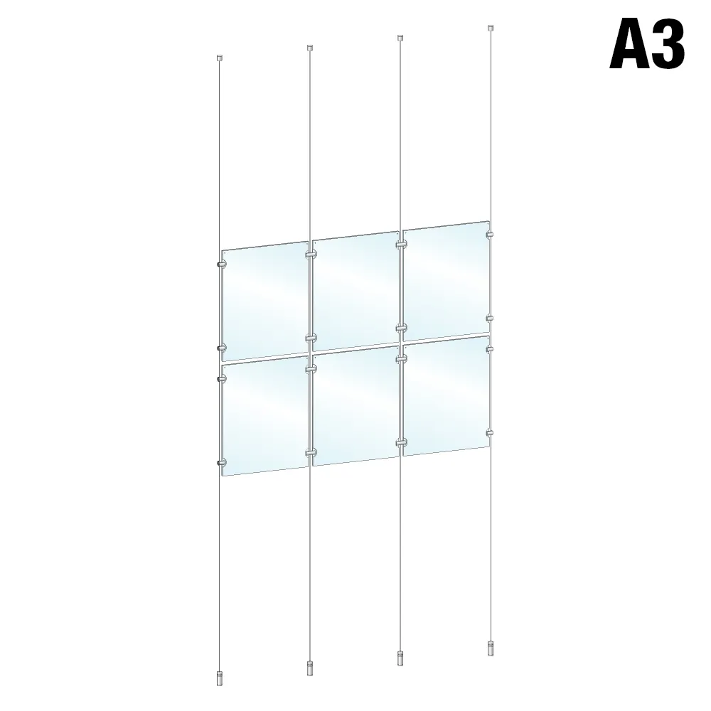 Window cable displays are designed to display A3 (420 x 297mm) standard sized posters in portrait format, with six frames included with this kit to display (12) posters at once! The dual-sided poster holders are great for placement in storefront windows where they can be viewed inside and outside the business, typically found in retail stores, information centres, real estate agencies, shopping centres, museums, and more! The slide in design allows for quick poster changes without any tools needed, and the 3mm thick clear acrylic panels have small button magnets embedded within to keep the sides closed and prevent posters from sliding out of place.