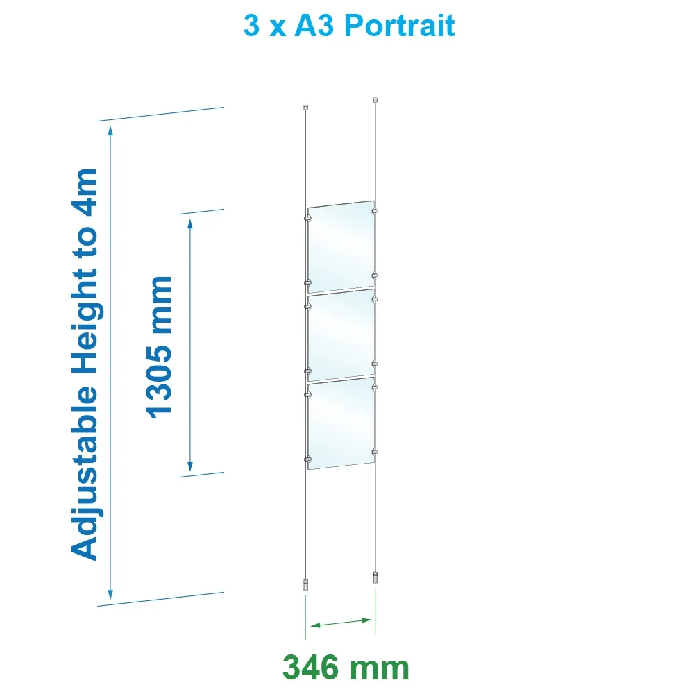 This cable window display has brass hardware for durability. The 4 metre cable included with these units can be cut to fit the length of different locations. The hanging wire kit, cable window display has A3 acrylic frames in a single column, with many more configurations available. These 3mm acrylic frames have magnets embedded in the top of the frame to help keep the frame closed. This allows easy changes of graphics while still maintaining a professional look.