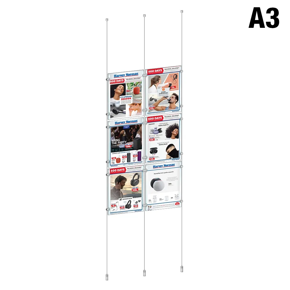 This window cable display system is a great addition to real estate agencies, retail stores, information centres, museums, shopping centres and more! The kit features a 3 x 2 array of dual-sided poster frames, perfect for use in storefront windows or as a dividing wall to maximise display. There are six poster holders included that display (12) total graphics within the clear acrylic frames. The holders are meant to display A3 (420 x 297mm) standard sized graphics in portrait orientation and have a slide-in design that makes poster changes quickly with no tools needed. There are small button magnets embedded within as well that keep the sides closed and help keep posters in position during use.