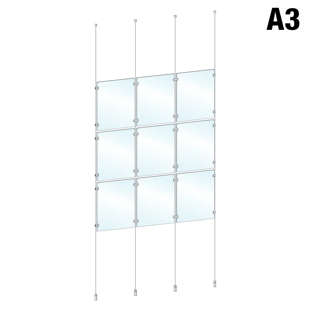 The A3 window display, like hanging real estate signs, creates an eye-catching display thanks to the floating effect achieved with suspended the poster frames between the floor and ceiling. The top and bottom fittings are hand tightened to keep the wires taut and maintain the professional appearance. There are four stainless steel wires included that are 4m long to span the floor to ceiling distance of most locations and are able to be cut to size to fit your specific needs. Standoffs and joiners feature an edge grip design that securely attaches the frames to each other and the cables. Order by 3pm EST to receive same day shipping to anywhere in Australia with this and most other in stock products, only from Slimline Warehouse!