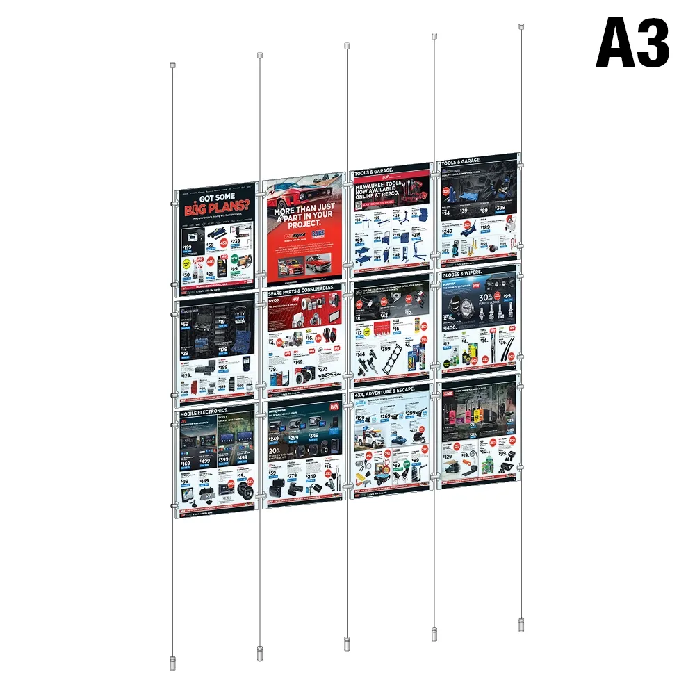 The signage display system, like real estate window displays, has small button magnets embedded in the panel to keep them closed and prevent posters from moving out of place. The kit utilises (5) 4m long cables that can be cut to length to easily fit most floor to ceiling spans. The top and bottom fittings are hand tightened to keep wires taut, with stainless steel joiners and standoffs securely attaching the frames to each other and the cables. Slimline Warehouse offers same day Australia-wide shipping with this and most other in stock products if purchased by 3pm EST, buy online today!