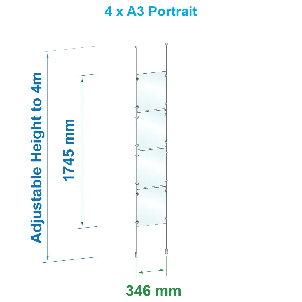 These display cable systems have brass hardware that is finished with a silver satin finish and that provide a stylish look. A 4 metre cable can be cut to different lengths in order to fit in nearly any location. The window displays, display cable systems have 3mm acrylic frames to place graphics. This kit includes a single column of (4) A3 (420 x 297mm) poster holders, with additional configurations available up to 5 columns with 20 frames!