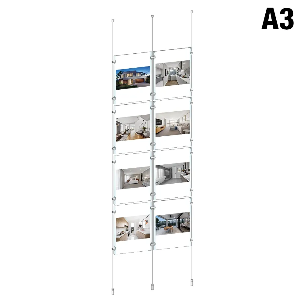 This A3 cable display is great for retail stores, shopping centres, real estate agencies, information centres, and more to display a large amount of posters in a single space to maximise view! There are (8) total poster frames included with this unit that each hold A3 (420 x 297mmm) graphics in portrait orientation. The frames have a slide-in design that makes change outs quick and easy with no tools necessary. The panels themselves are made from 3mm thick acrylic with polished edges, and have small button magnets embedded that help keep posters from sliding out of position and ensure the sides stay together whilst on display.