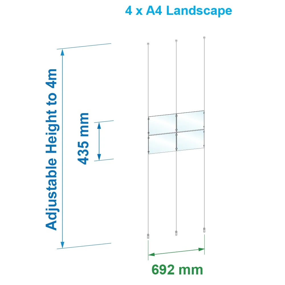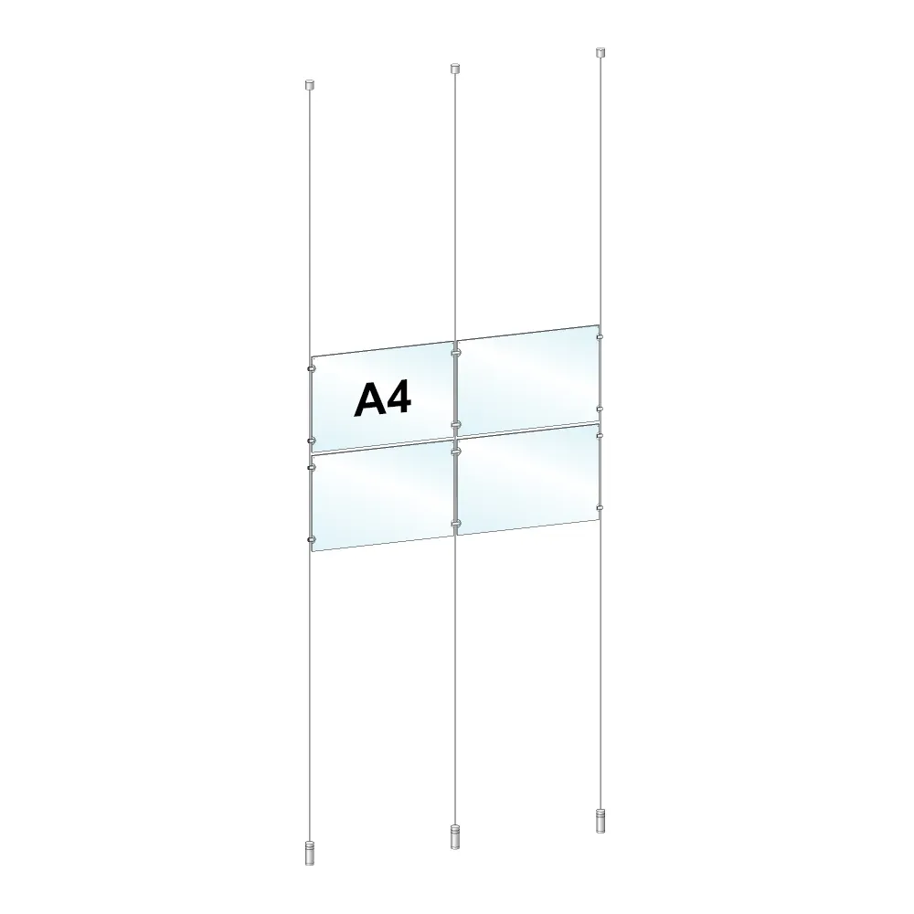 This cable display system helps real estate agencies, information centres, retail stores, museums, and more to advertise and promote in an eye-catching manner! There are (4) acrylic frames that can be arranged in two rows, with each able to hold an A4 (210 x 297mm) poster on both sides! The dual-sided frames make it easy to advertise in multiple directions at once, and the easy change out design requires no tools for poster switch outs in seconds. Simply pry open the two sides, switch out the graphics and let them close! There are embedded button magnets in the acrylic that help to prevent flopping open as well.