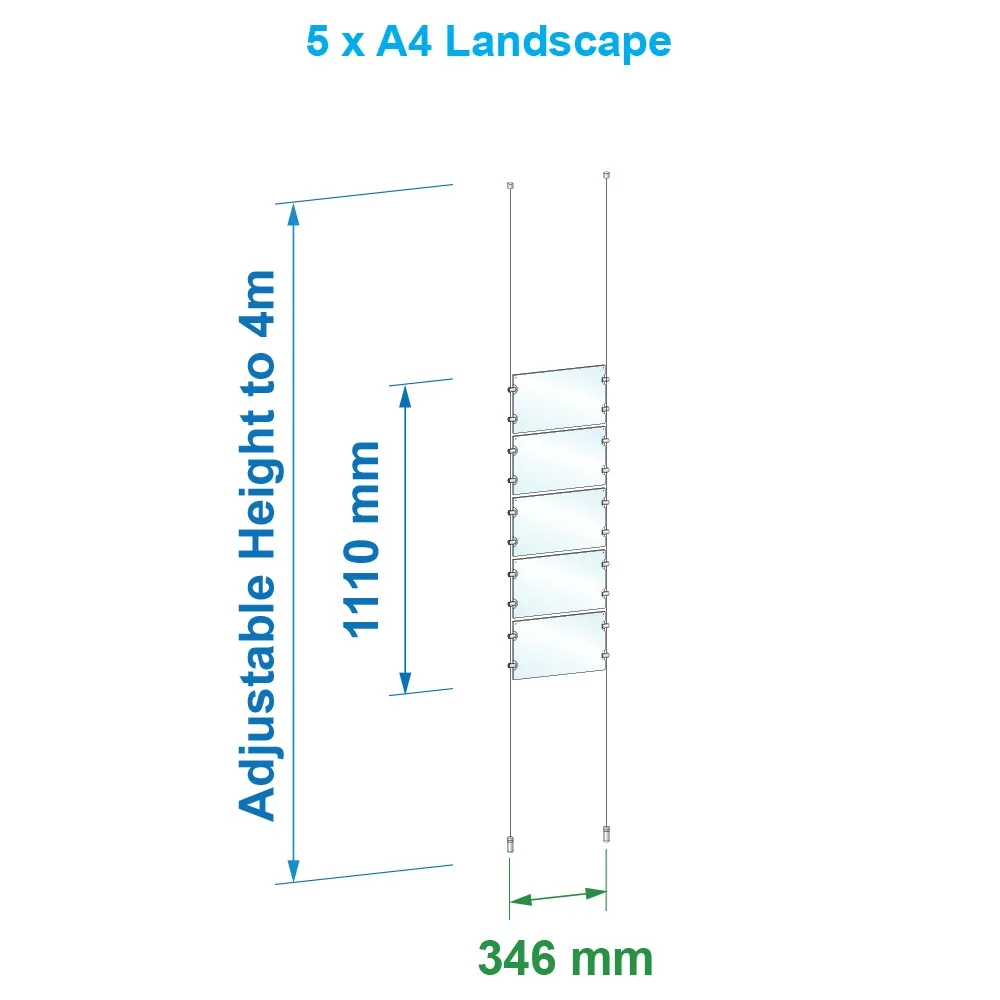This wire hanging system is found in real estate agencies, information centres, retail stores, and lobbies. The cable kit has brass hardware which has a silver satin finish- a brighter and more attractive finish than bare stainless steel. This window display, wire hanging system has a 4 metre cable that can be cut to fit different locations. The wire hanging system displays A4 graphics in landscape orientation, with 5 to 25 pockets across as options.