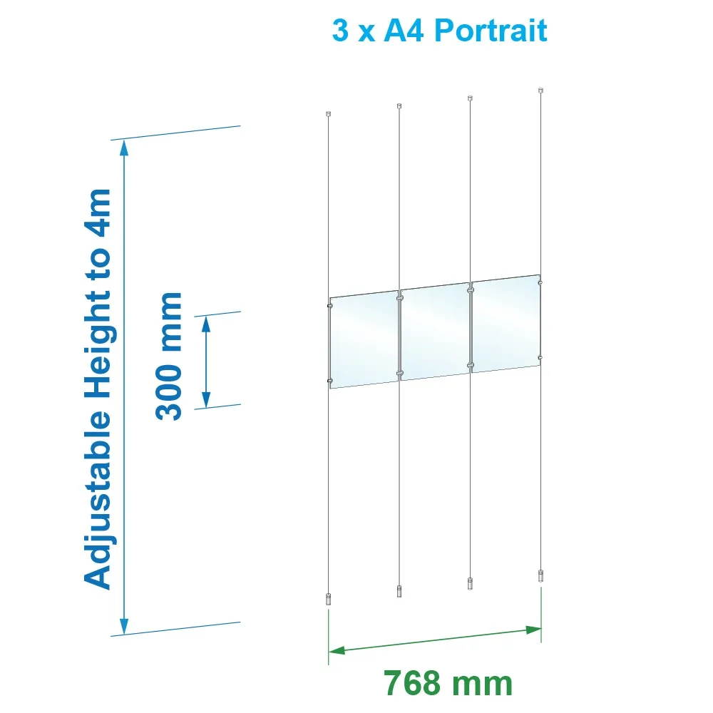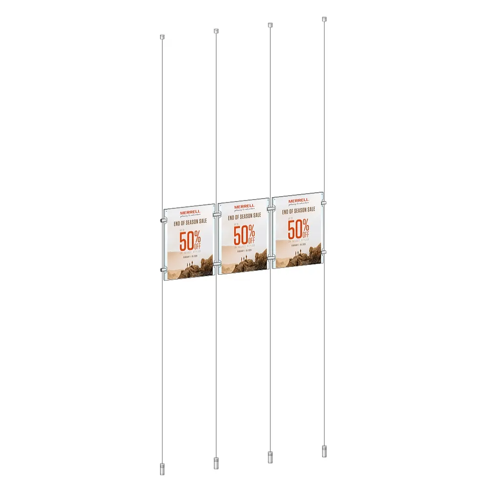 A ceiling cable hanging system makes displaying posters to people in multiple directions from a single display easy. There are (3) poster frames included that are all designed to display A4 (210 x 297mm) posters in portrait orientation. The holders are made from 3mm thick clear acrylic to provide a clear view of posters, with graphics able to be placed facing outward on both sides to maximise display space and reach more passersby from a single vantage point! The slide-in design of this system makes it easy to change out graphics without any tools needed, with the panels sides gently prying apart for access to the interior. Small button magnets are embedded into acrylic help keep the unit closed while on display.