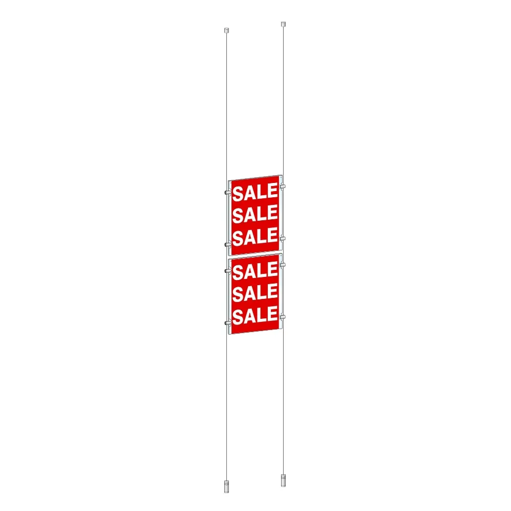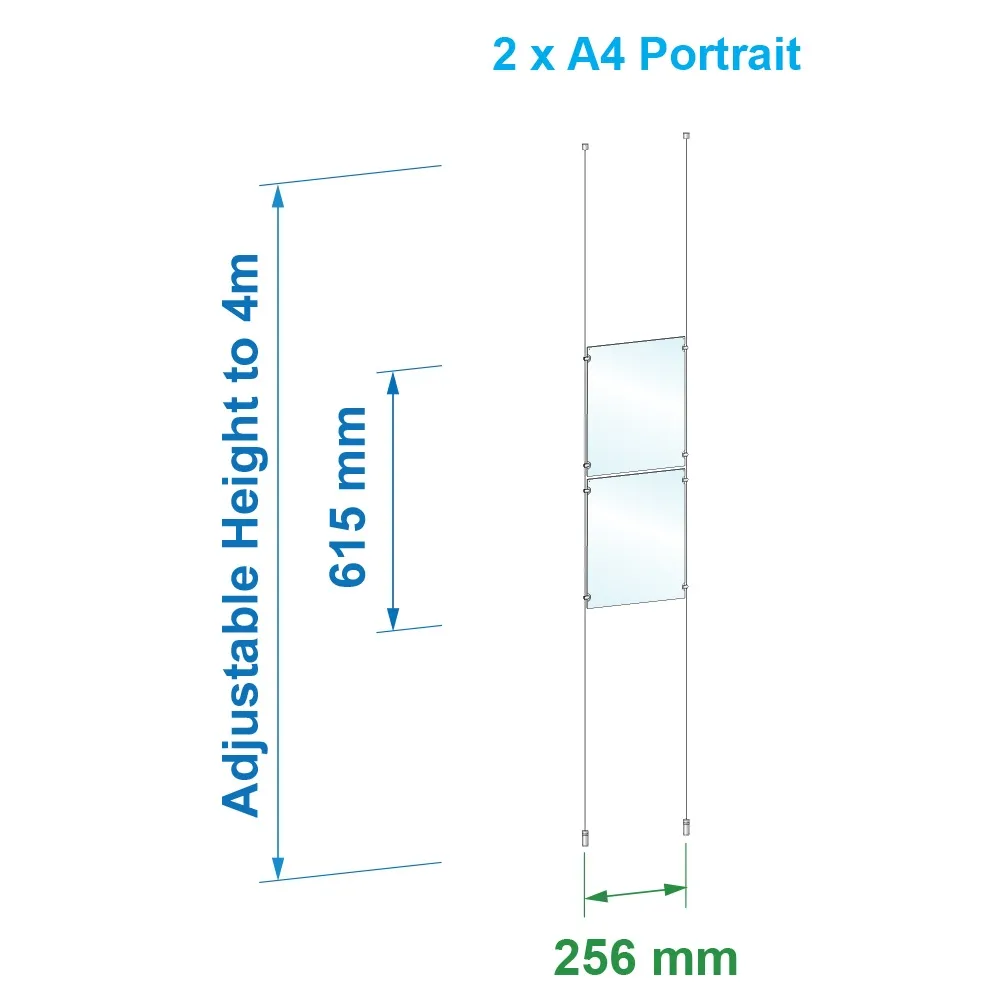 These dual-sided cable kits are found in real estate agencies, retail stores, information centres, and other businesses as promotional tools. These display cable systems, cable kits use acrylic frames that can hold A4 sized graphics. Different configurations are available, with this kit having 2 pockets in a single column and other options including 4, 6, 8, or 10 frames across. The wire display has button magnets to hold the frames closed and keep graphics in place.