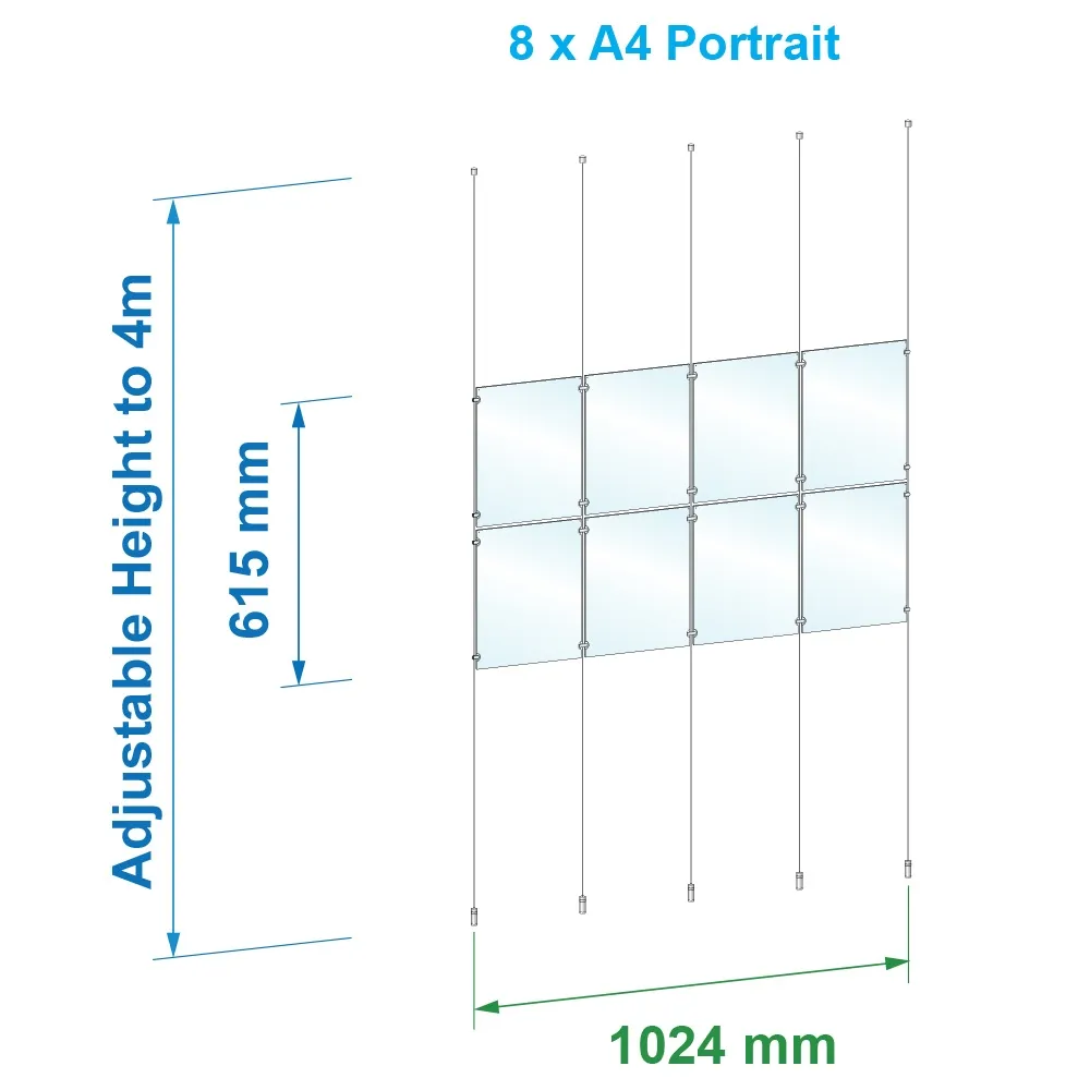 Floor to ceiling cable systems are great for placement in retail stores, shopping centres, real estate agencies, information centres, travel agencies, and more to offer heaps of information in a single eye-catching display! This unit includes (8) individual poster holders arranged in a 2 x 4 array that is great for placement in storefront windows, where the dual-sided design reaches passersby both inside and outside your location. The 3mm thick clear acrylic frames can each display A4 (210 x 297mm) posters that are in portrait orientation. The slide-in design of these poster holders makes poster changes easy in seconds with no tools needed, and there are small embedded button magnets that keep the posters in place whilst prevent flopping.