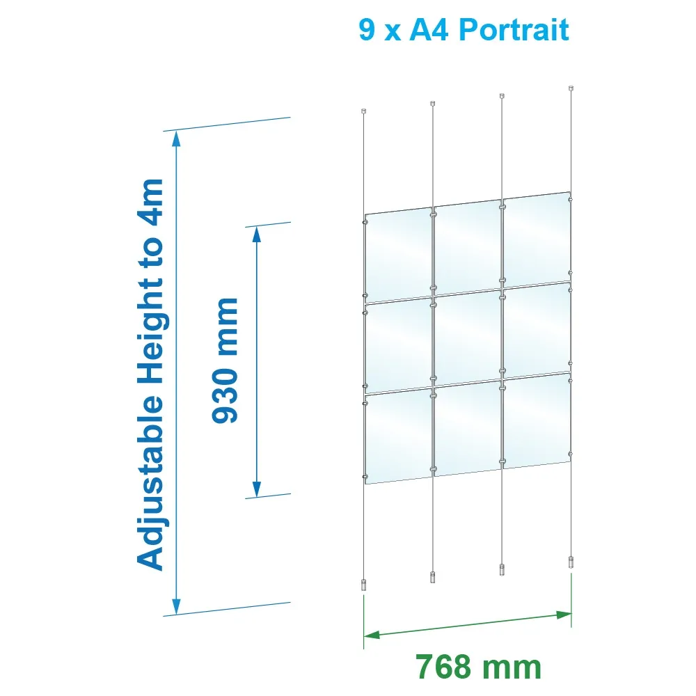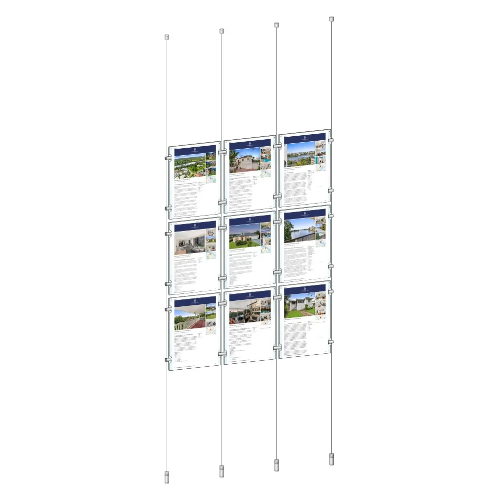 Ceiling display systems use clear acrylic poster frames to display real estate listings, destination information, product specifications, advertisements, and more in a highly visible manner. This kit uses a 3 x 3 array of 3mm thick clear acrylic holders to display A4 (210 x 297mm) posters in portrait orientation, with the dual-sided design making this display perfect for use in storefront windows or as a dividing wall within any location. The slide-in design of the poster holders allow for quick changes in seconds with no tools necessary, and embedded button magnets prevent the graphics from sliding out of place whilst keeping the two panel sides snugly together.