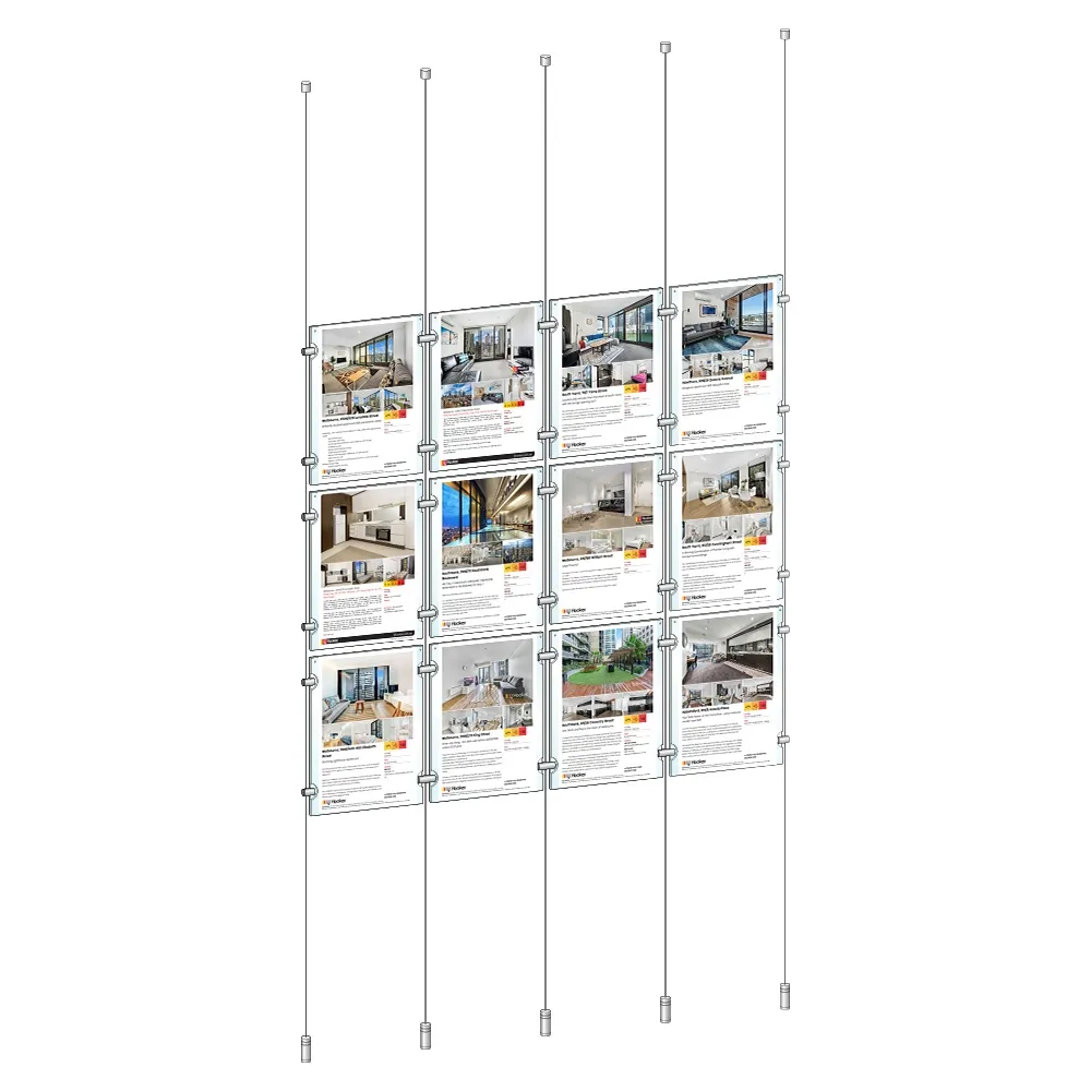 Cable displays use acrylic frames to hold A4 (210 x 297mm) posters that are in portrait orientation, with the dual-sided displays able to display 12 total posters at once! The 3 x 4 matrix design of this display is perfect for use as a dividing wall or in storefront windows, where the the 2-sided design maximises space by offering views to visitors inside and outside of your location! A slide-in design makes graphic changes easy with no tools required, as the two sides of the 3mm thick clear acrylic panels can be gently pried apart for access to the interior. There are small button magnets embedded in the top of each holder as well that help to keep posters in place and stop the sides from opening over time.