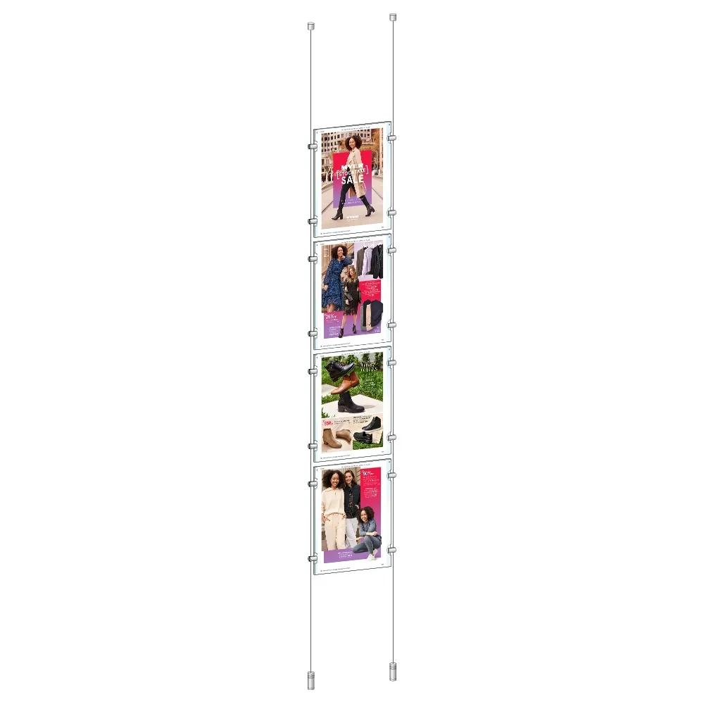 This real estate window display, also known as a hanging cable system, has brass hardware to hold up the acrylic frames. The 4 metre cable can be cut to fit different environments. The real estate window display is normally found in agencies, information centres, retail stores, restaurants and office buildings.