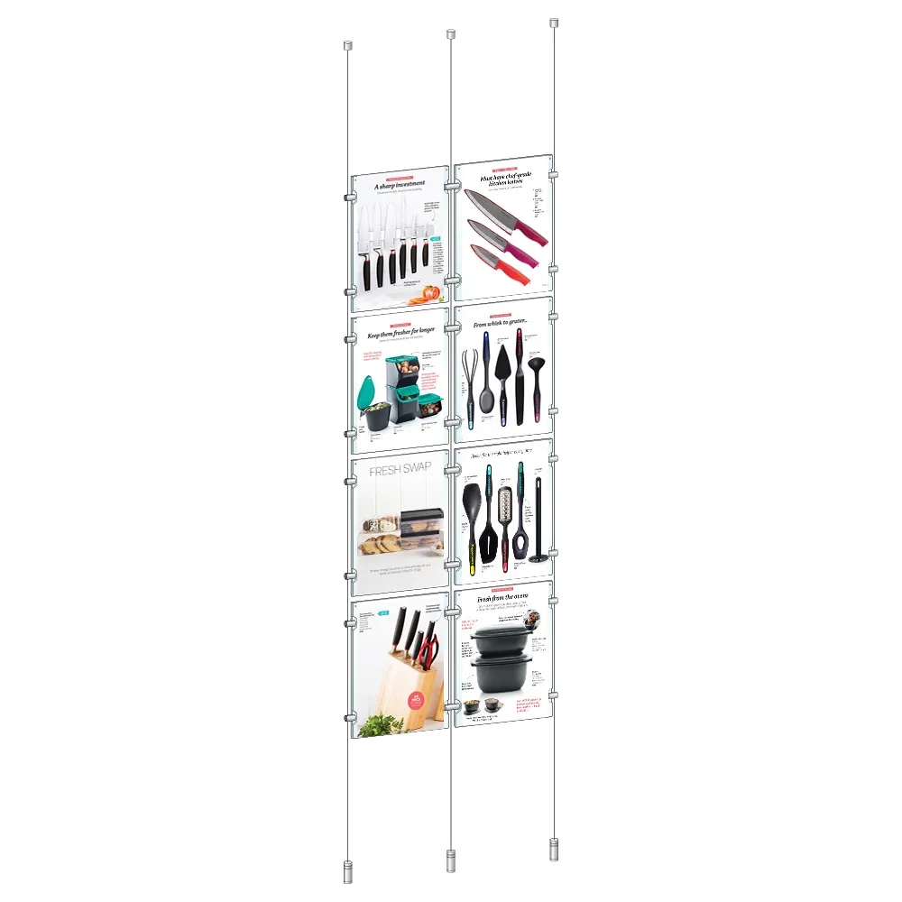 A floor to ceiling cable system uses clear acrylic frames to display posters suspended using wires to create a floating effect that draws passersby attention! The two-sided design allows these units to act as a dividing wall or be placed in storefront windows to promote and advertise both inside and outside of your business. Each frame holds an A4 (210 x 297mm) poster in portrait orientation, with the slide-in design making switching out posters fast and easy with no tools needed. The 3mm thick acrylic panels can be gently pried apart for interior access, and there are small embedded button magnets that help to keep the panels shut while stopping the posters from sliding out of place.